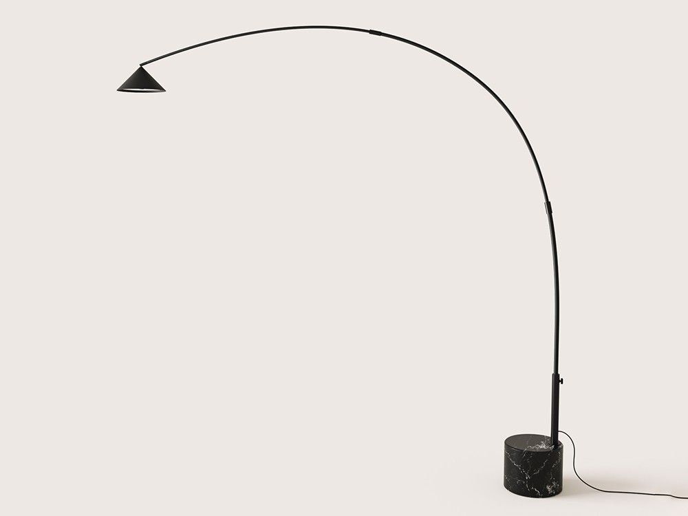 Торшер из черной матовой стали в виде арки с мраморным основанием и небольшим металлическим абажуром. Вы можете выбрать одну из двух комбинаций отделки: с белой мраморной основой и матовым латунным плафоном или с черной мраморной основой и матовым черным стальным плафоном.
