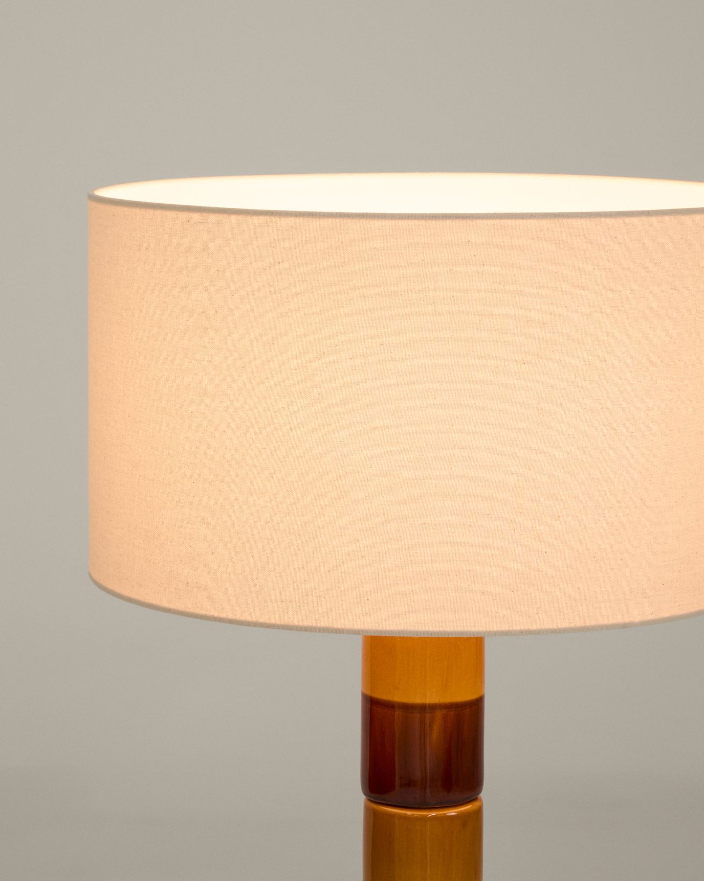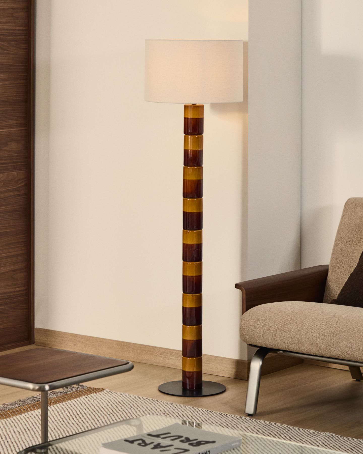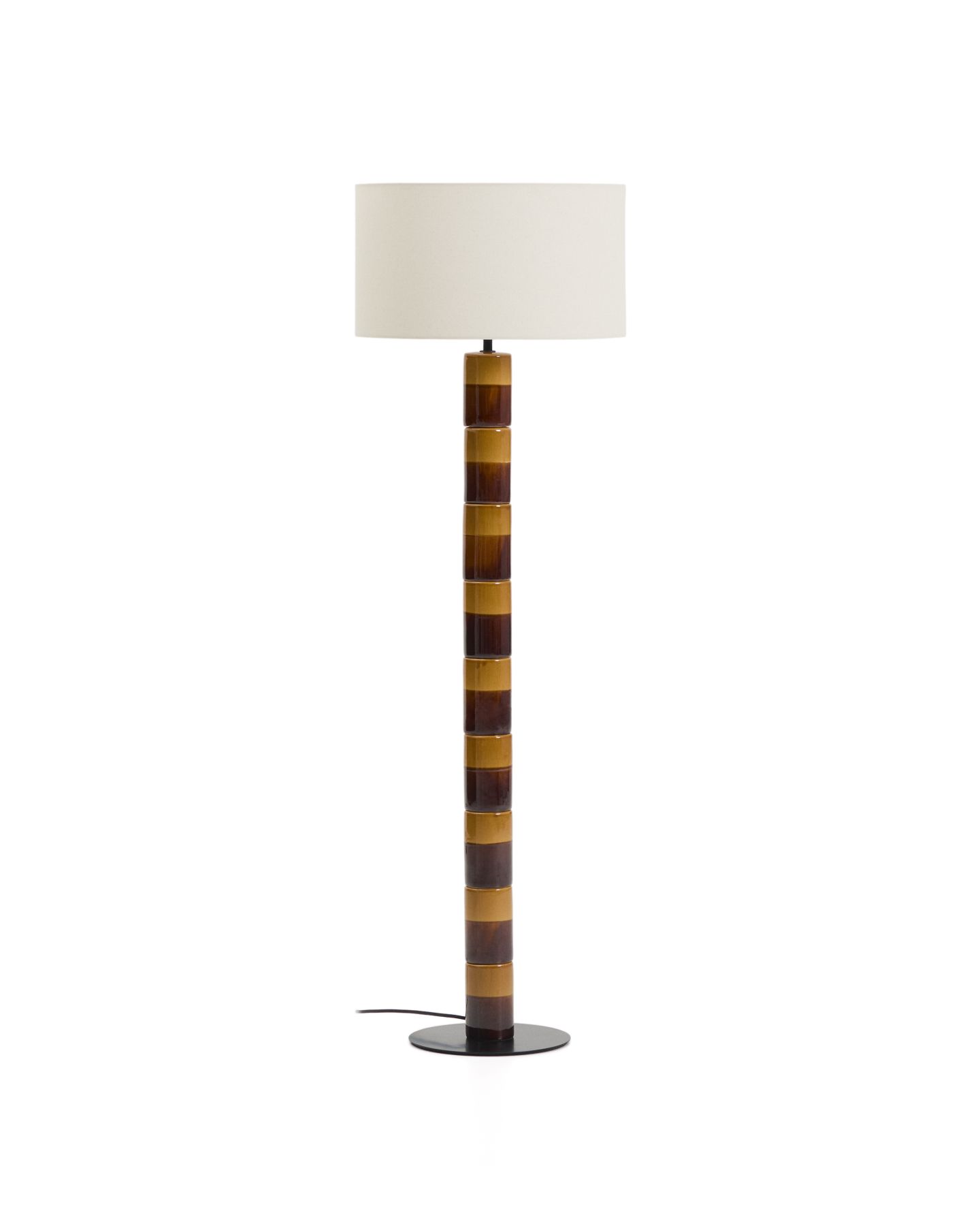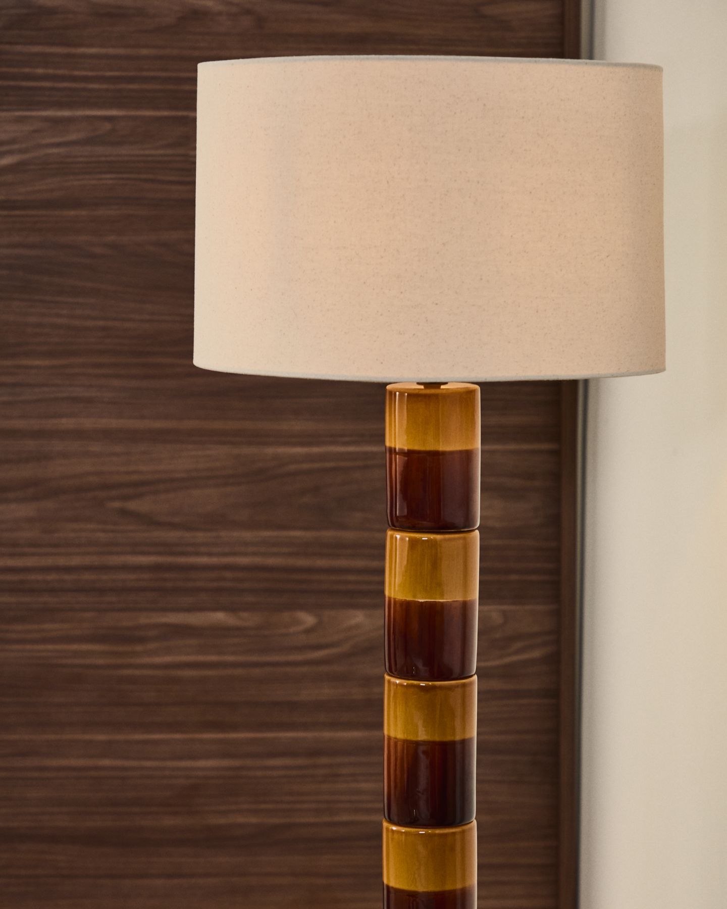 Эта коллекция выделяется своим глазурованным керамическим основанием, выполненным из чередующихся полос теплых тонов, которое привносит динамику и индивидуальность в любую комнату. Хлопковый абажур рассеивает свет и создает мягкую, обволакивающую атмосферу, идеально подходящую для гостиных, спален или уголков для чтения. Тонкий вертикальный дизайн подчеркивает презентабельность изделия, а эмалированная отделка основания добавляет визуальной привлекательности. Кабель, обтянутый сверхмягкой тканью, добавляет нотку изысканности и приятен на ощупь.