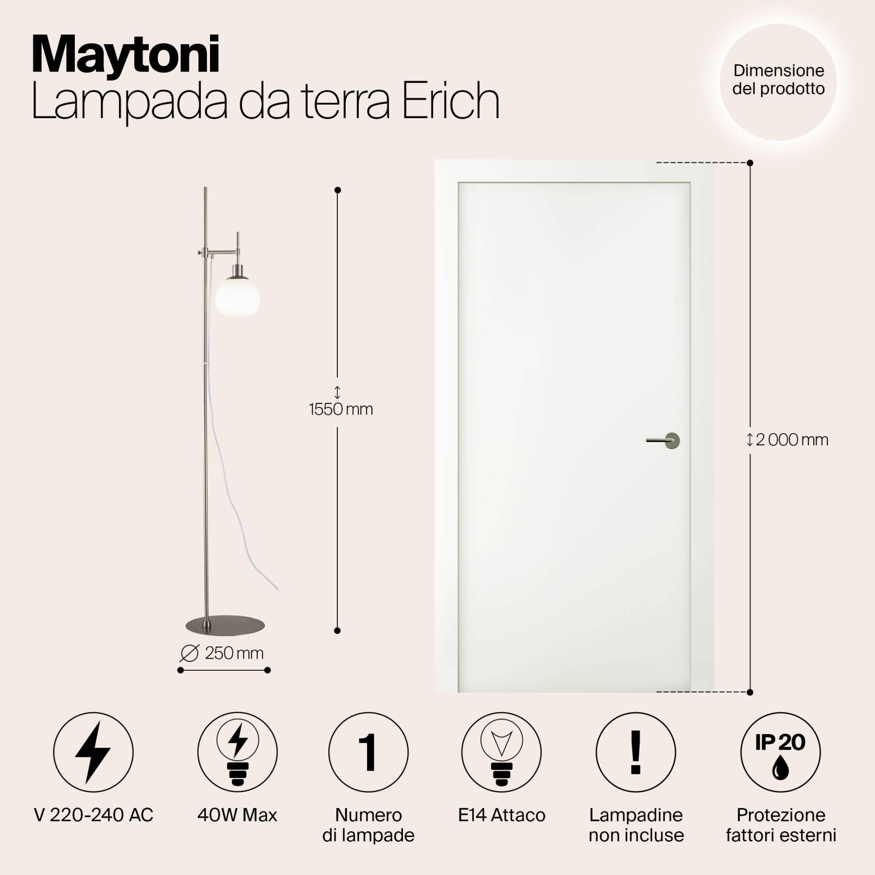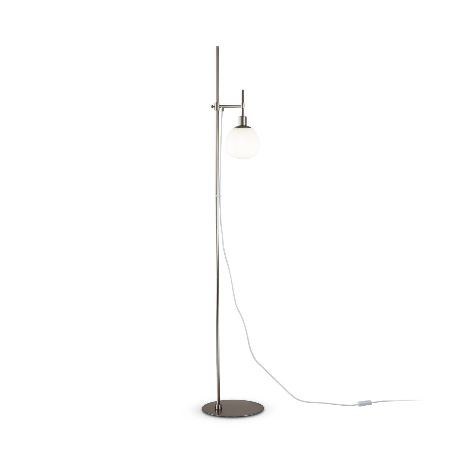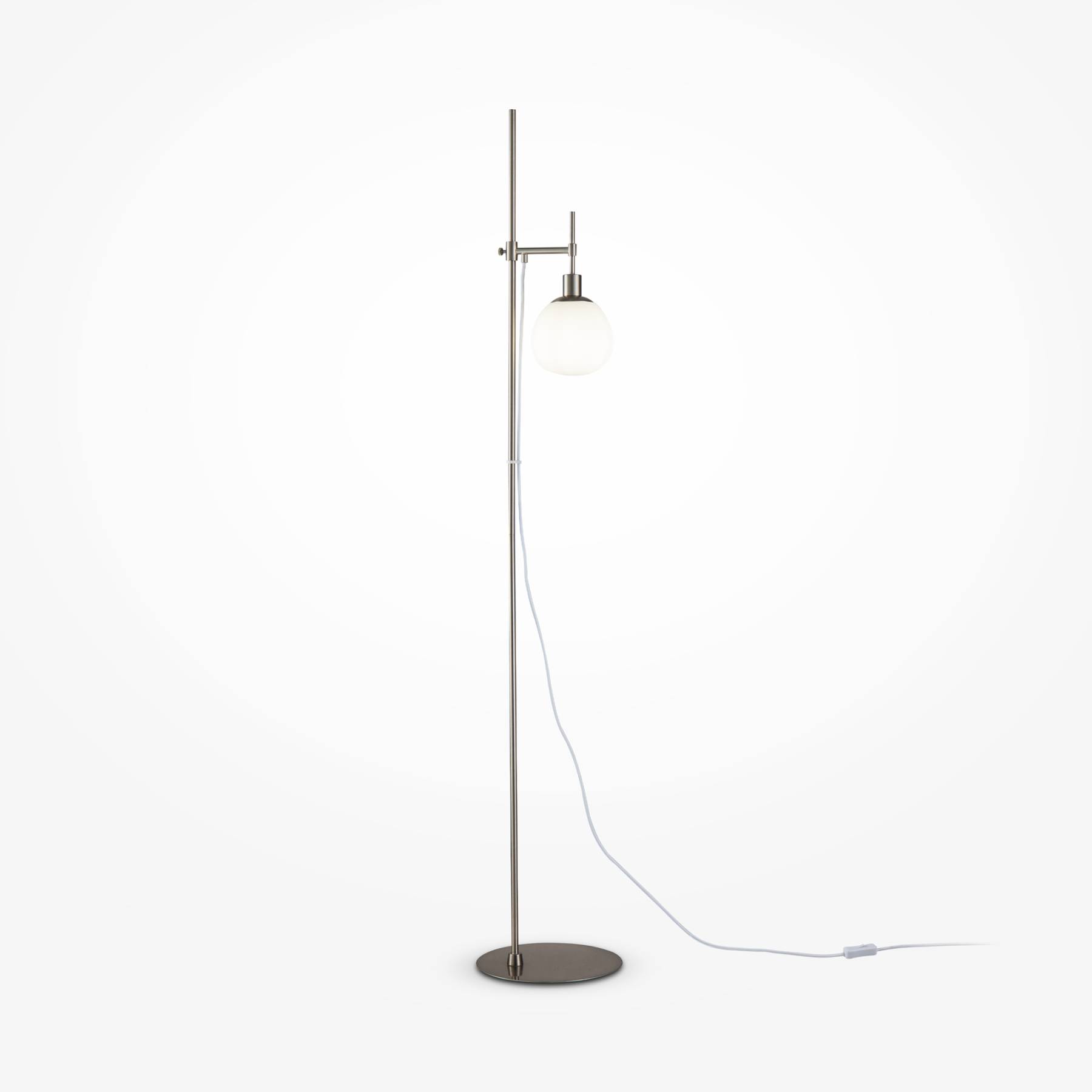 Металлическая арматура, цвет – никель, латунь. Плафоны – выдувное стекло белого цвета. Широкая семья. У торшера и настольной лампы можно изменять положение плафона. Регулируемая высота.