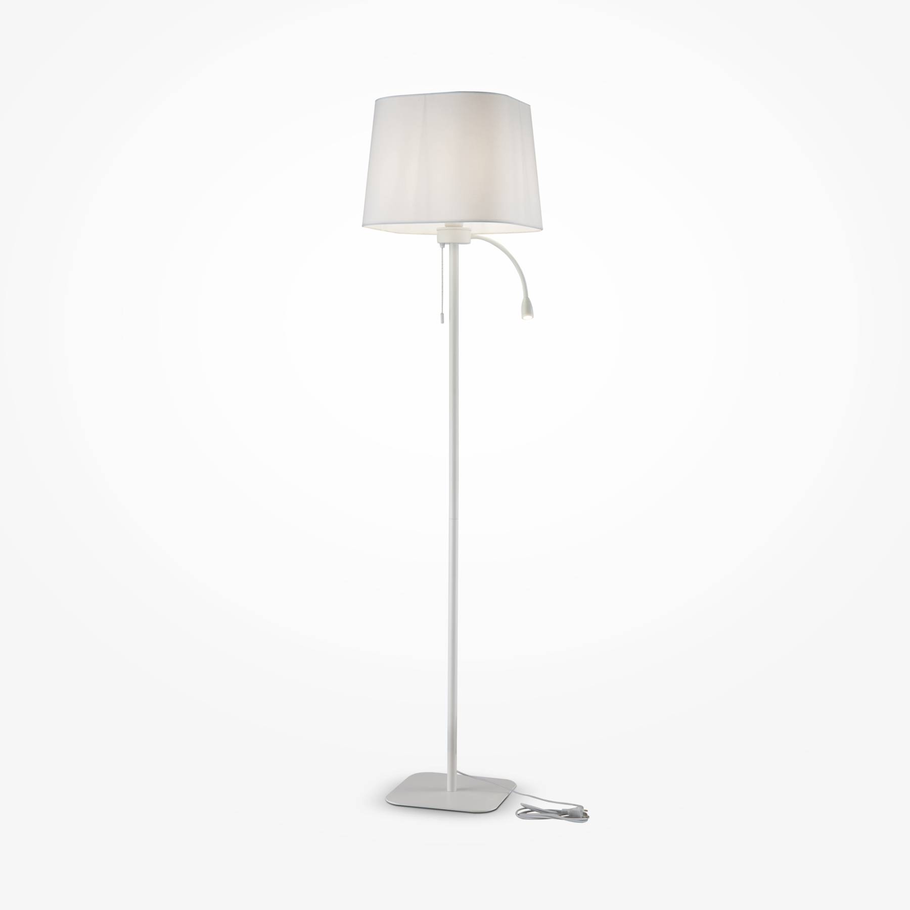 Металлическая арматура в белом и черном цвете. Материал абажура – текстиль, нанесенный на ПВХ, оттенки – белый и черный. LED-элемент для локальной под светки расширяет функционал модели.