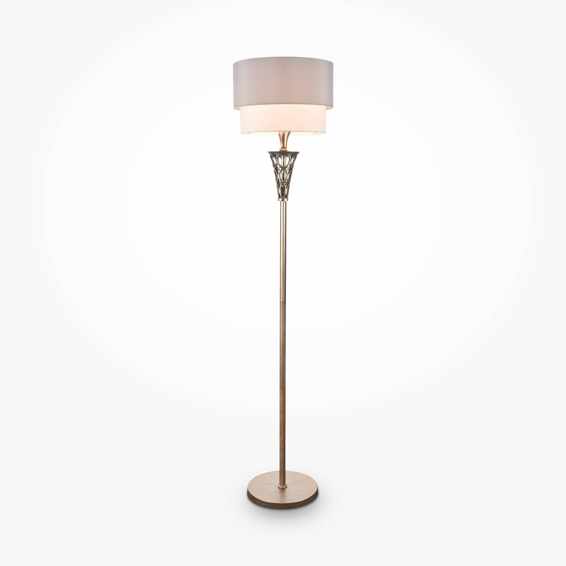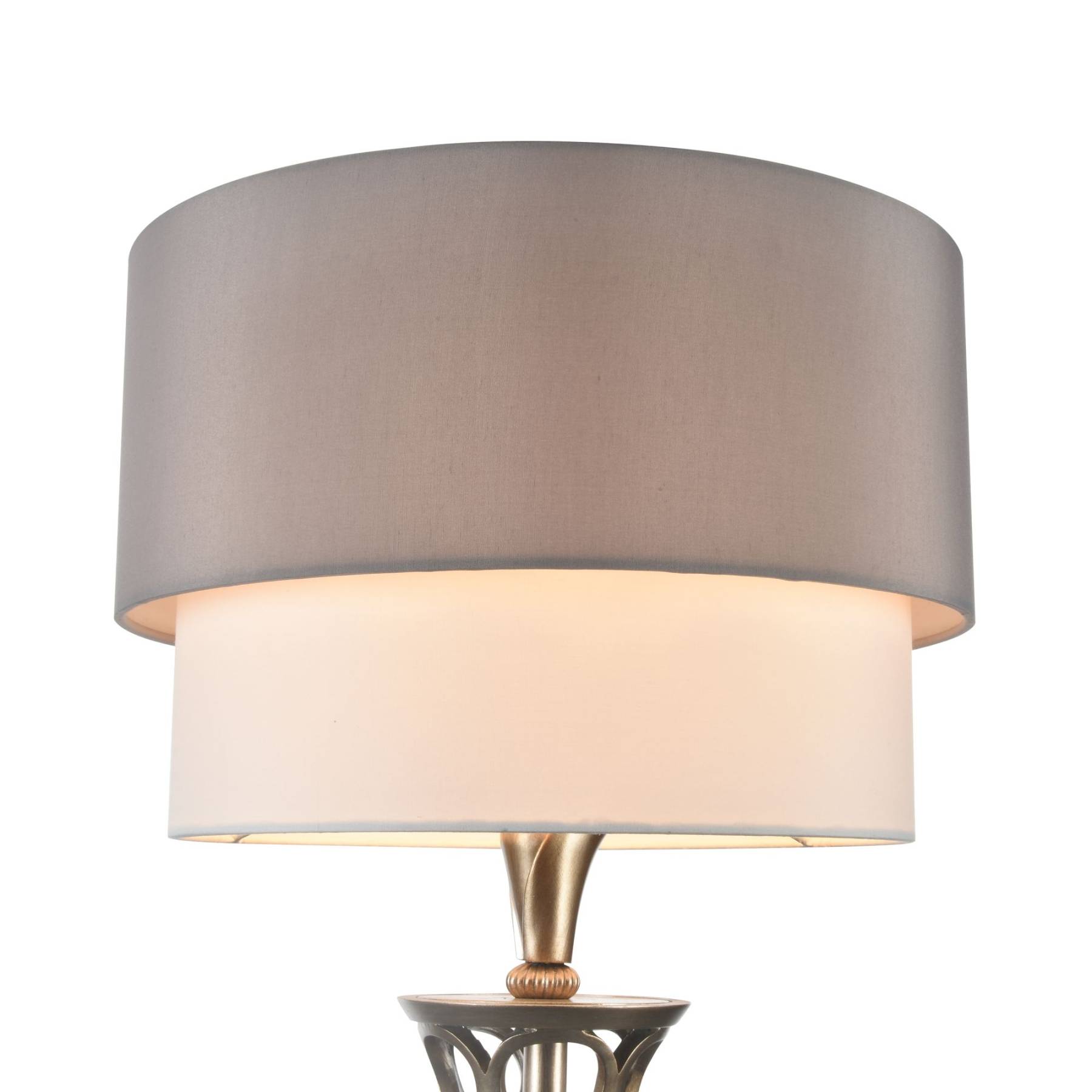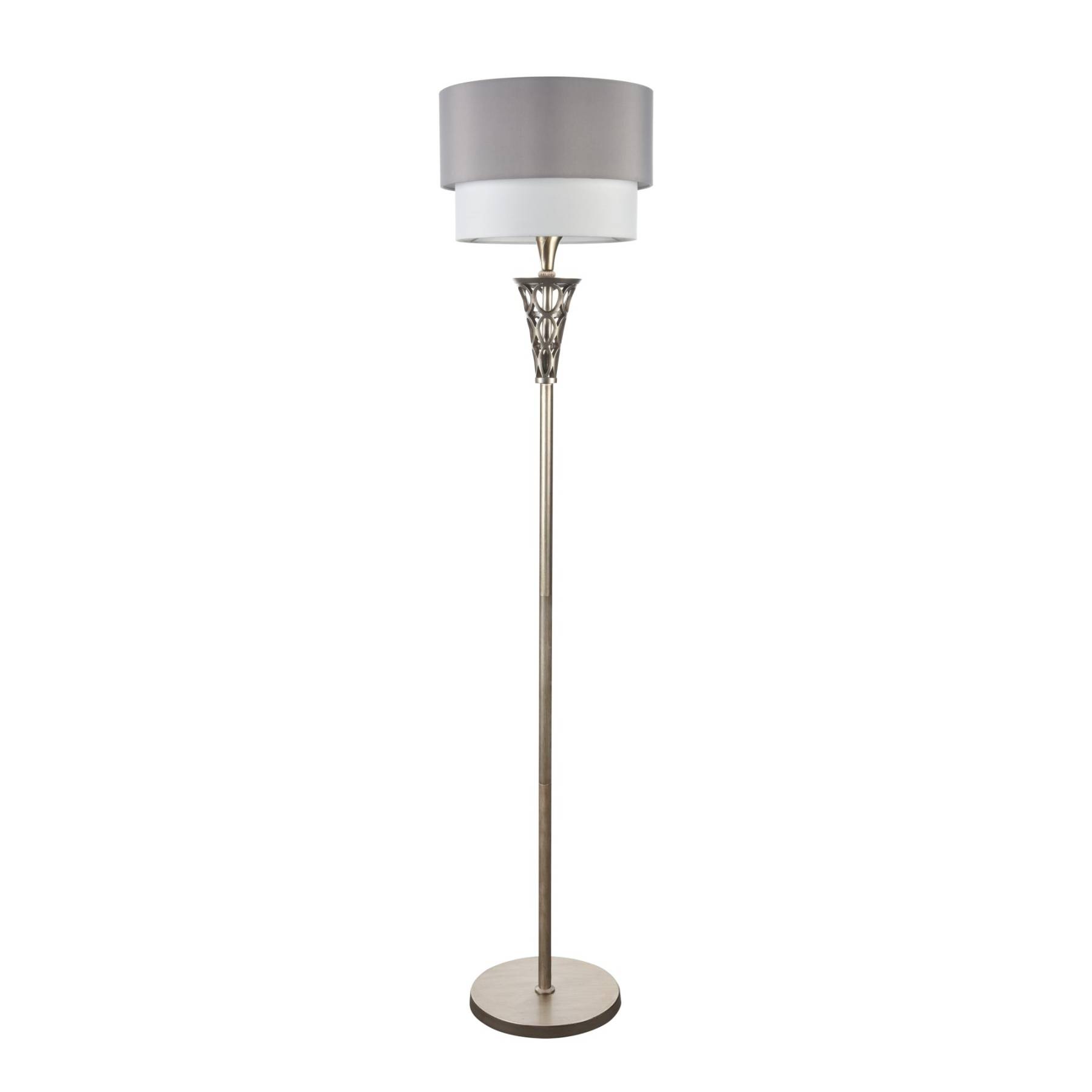 Металлическая арматура окрашена в цвет античного серебра. Двойные абажуры из хлопка на ПВХ, комбинация белого и серого цвета. Флористический декор. Высота люстр регулируетс