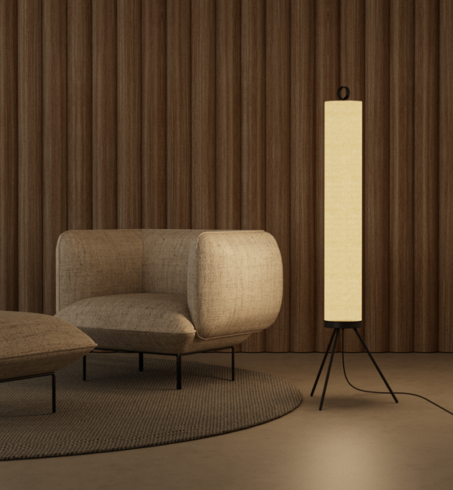 Торшер, выполненный из металла в черной отделке и абажуром из натурального льна.