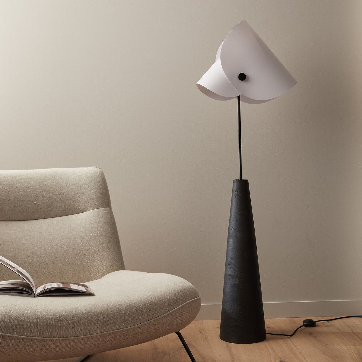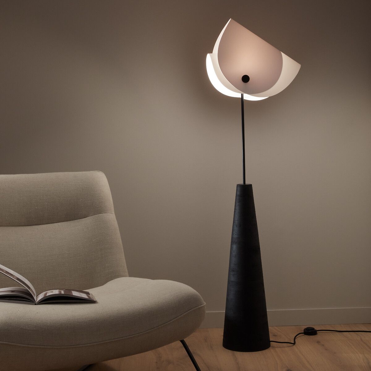 Создает впечатление застывшего в движении, словно скульптура. Торшер состоит из ножки и цоколя из массива мангового дерева, а также из двух диффузоров, направленных в разные стороны. Он обеспечивает как рассеянный свет, так и объем, создавая ощущение тихой невесомости.