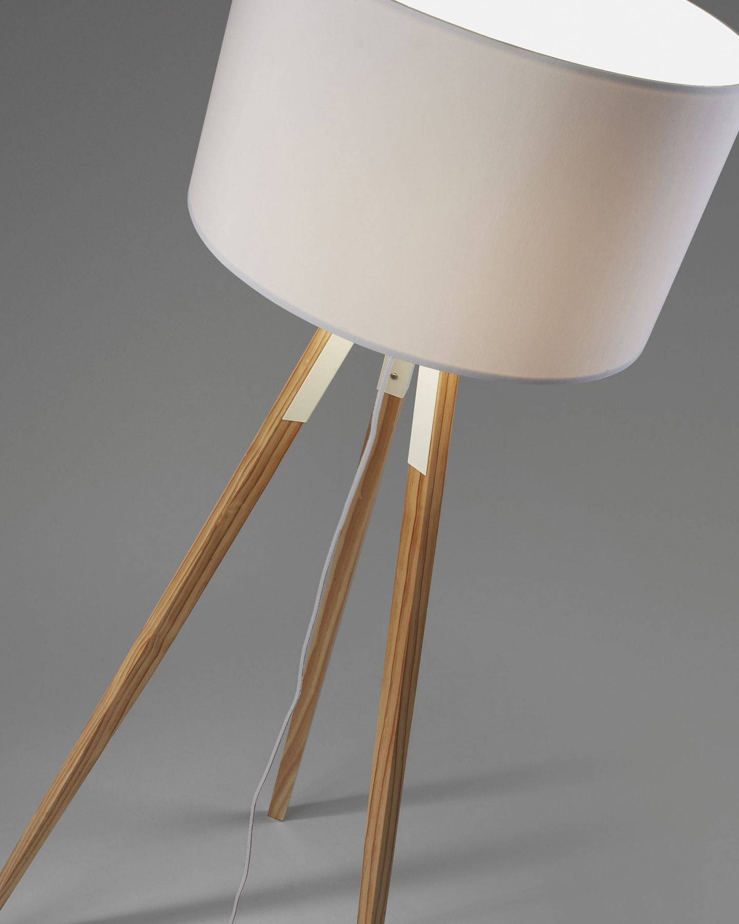 Торшер Uzagi состоит из стойки-треноги и широкого цилиндрического абажура. Стойка сделана из натуральной сосны. Она имеет симметричную форму, с шириной шага между каждой ножкой 57 см. Для прочности конструкции, ножки усилены сверху металлическими пластинами. Снизу к абажуру свободно подведен кабель в красной тканевой оплетке. Его длина – 183 см.