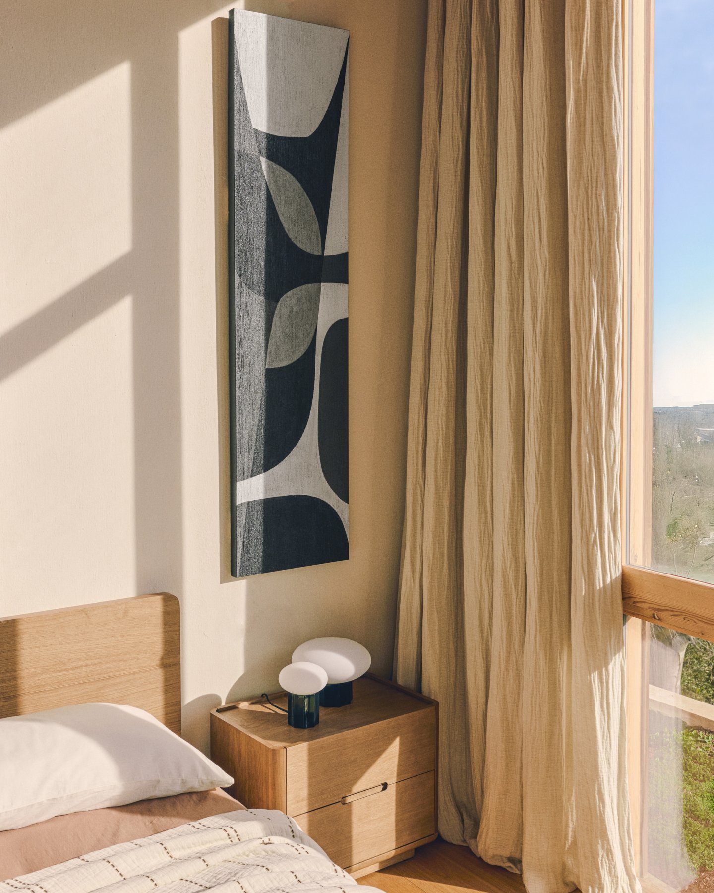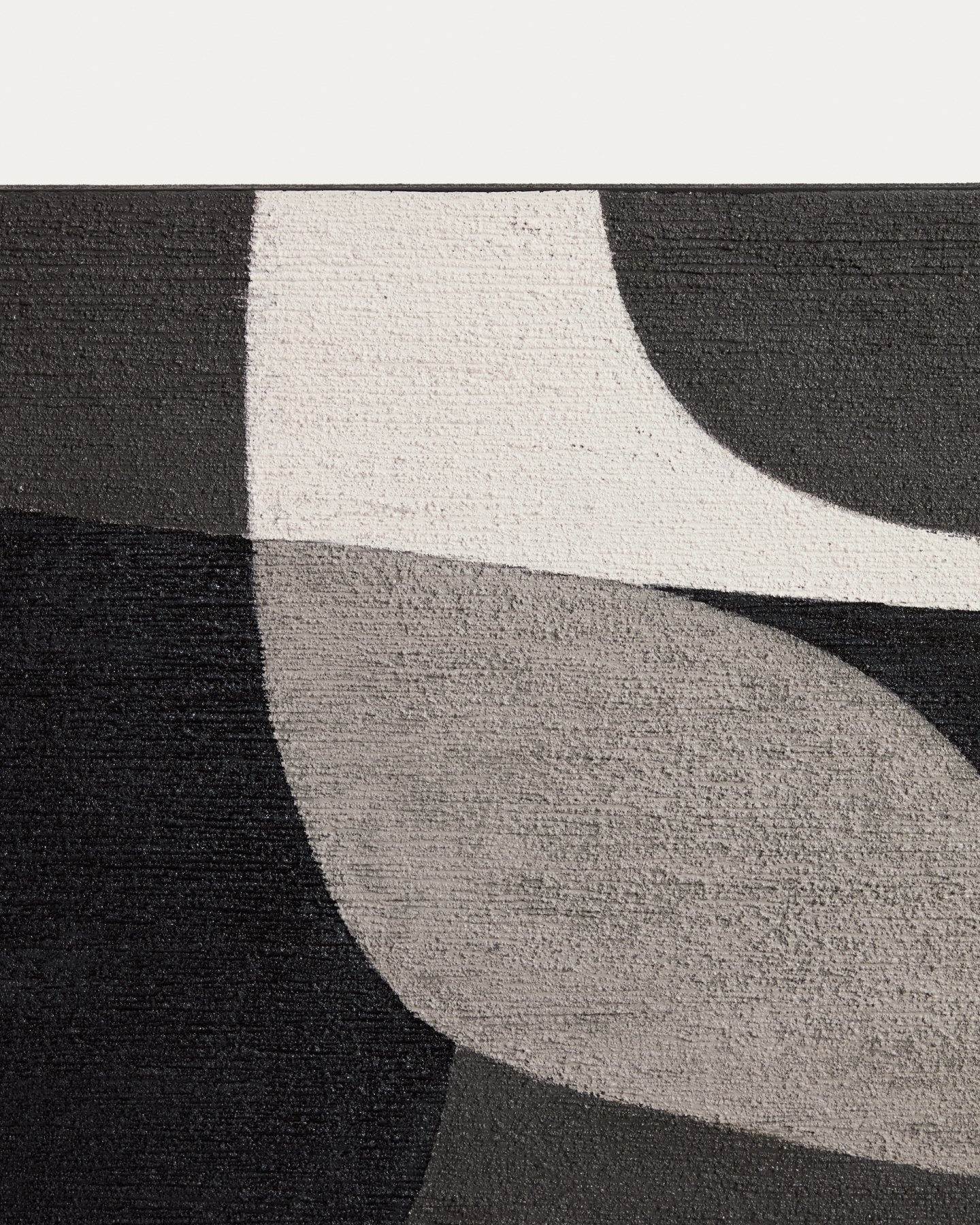 Картина Онуре исследует баланс между черным и белым с помощью округлых форм, которые перекрываются и вступают в диалог друг с другом. Композиция построена на контрастах света и тени, которые добавляют глубины и выразительности. В комплект входит D-образное крепление для подвешивания на стенах разного типа.