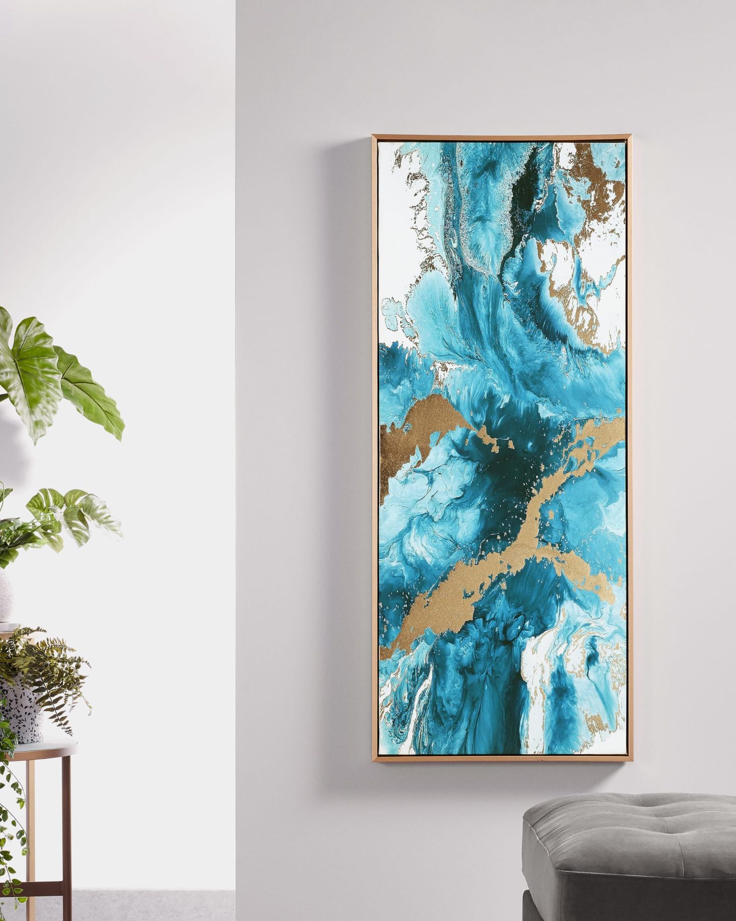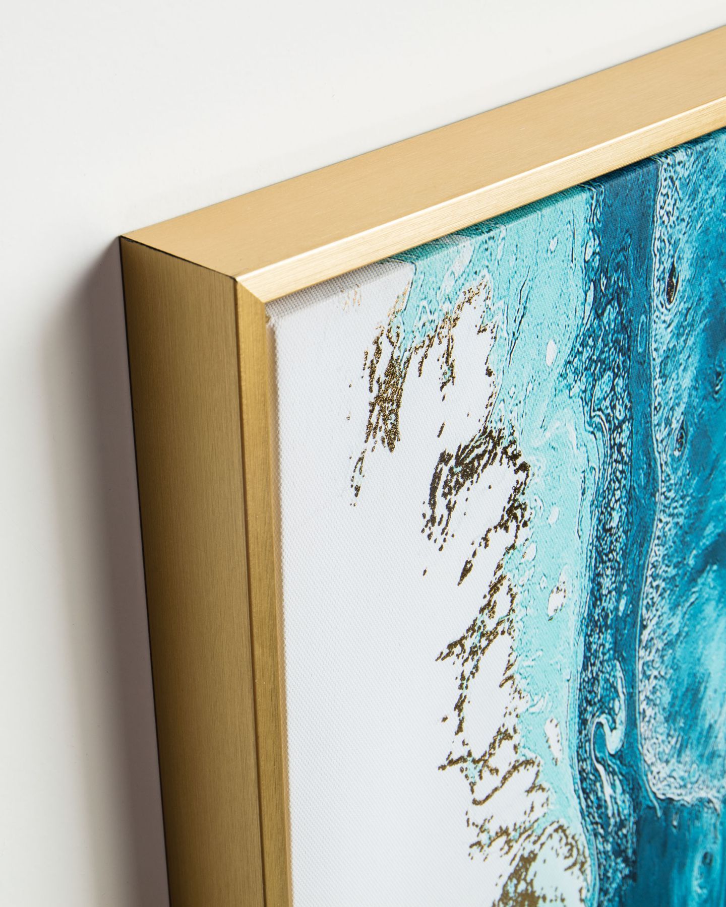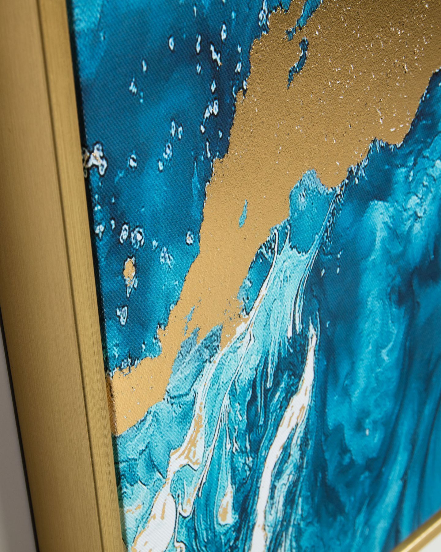 Этот принт изображает воды в оттенках синего, со следами сусального золота, чтобы принести легкое свечение. Рамка также золотая, чтобы дополнить картину. Этот крупный принт взывает о том, чтобы занять почетное место в одной из ваших комнат.