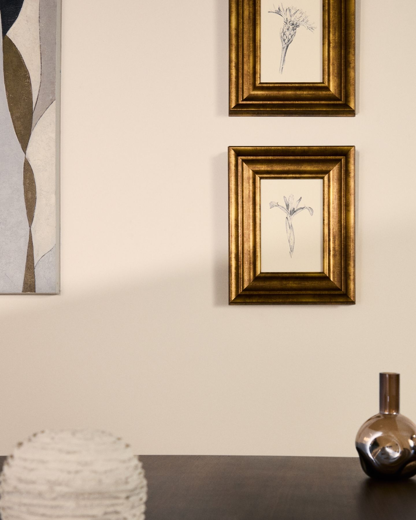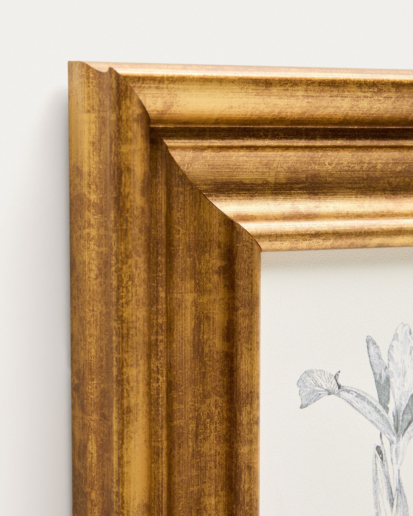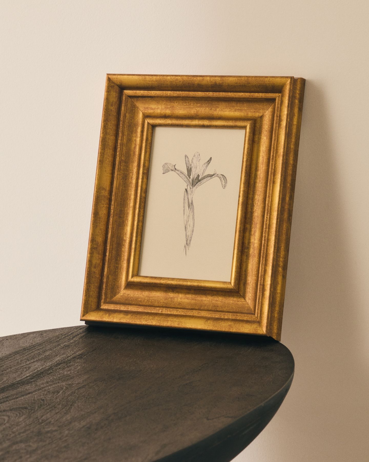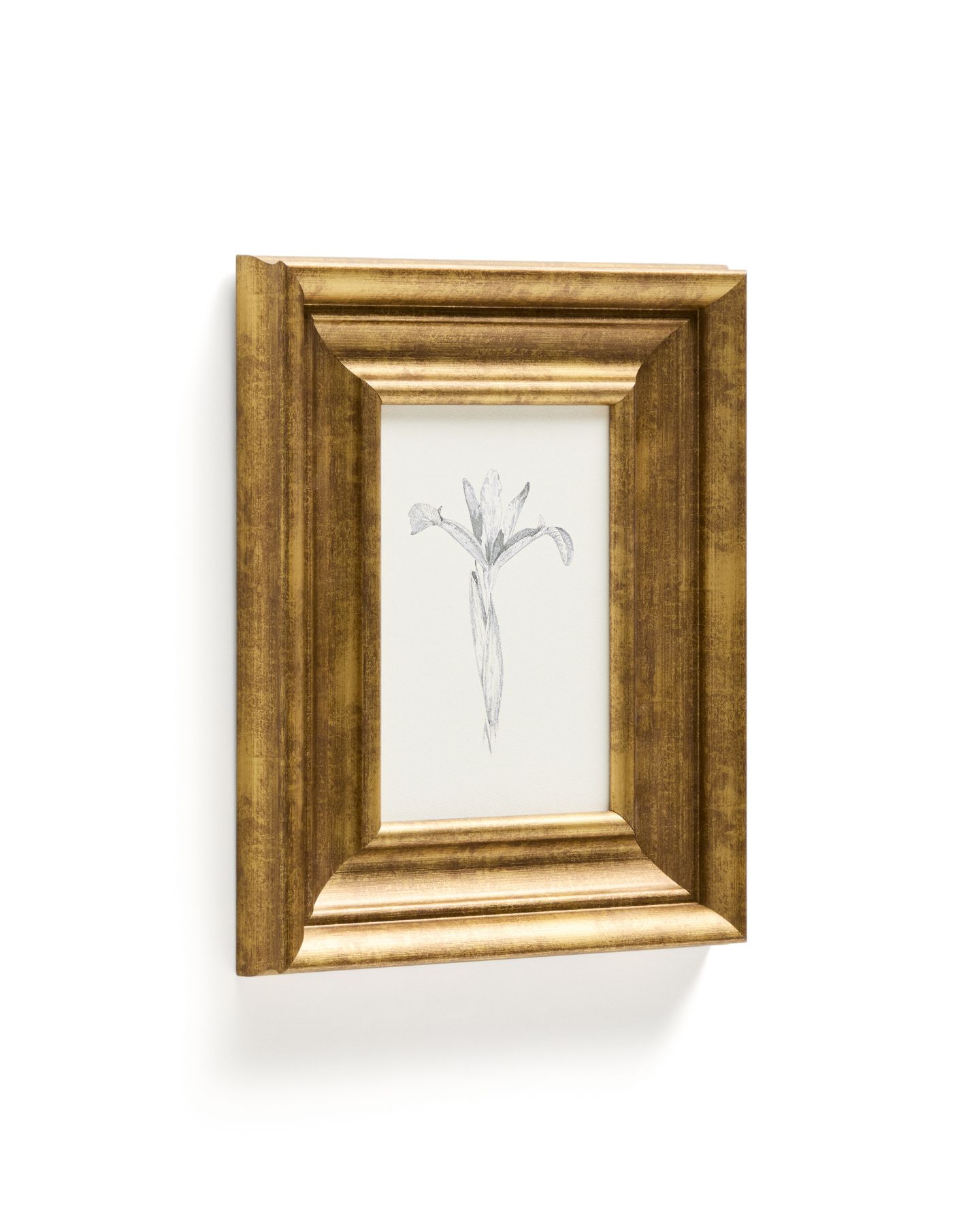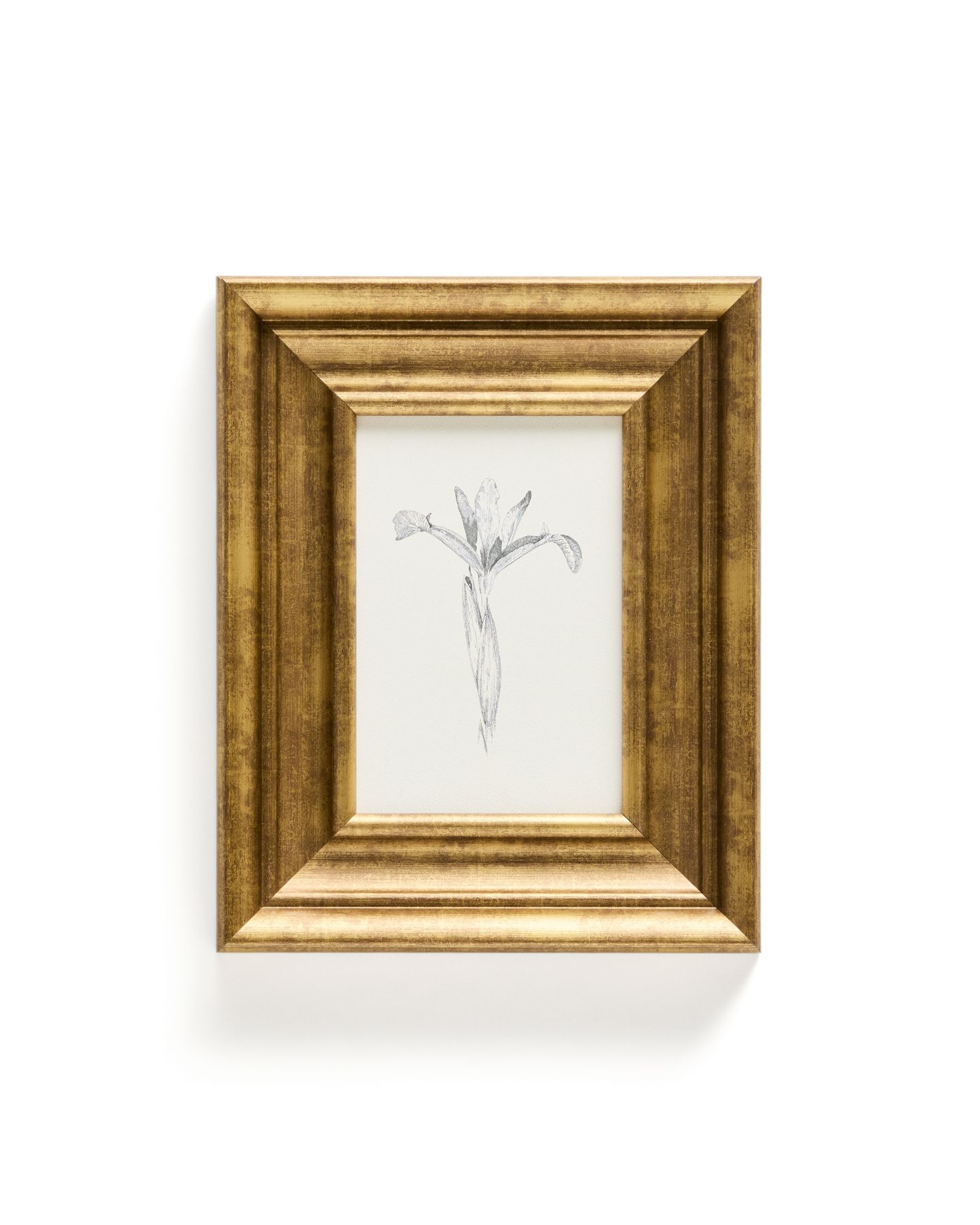 Эта картина представляет собой напечатанную ботаническую иллюстрацию, выполненную карандашом, которая передает спокойствие и вневременную элегантность. Изящный контур цветка выделяется на нейтральном фоне, приглашая насладиться мелкими деталями. Деревянная рама, окрашенная в античный золотой оттенок, воссоздает эстетику середины века. Идеальное украшение, которое добавит изысканности гостиным, спальням или коридорам, сочетая искусство и дизайн в едином декоративном элементе.
