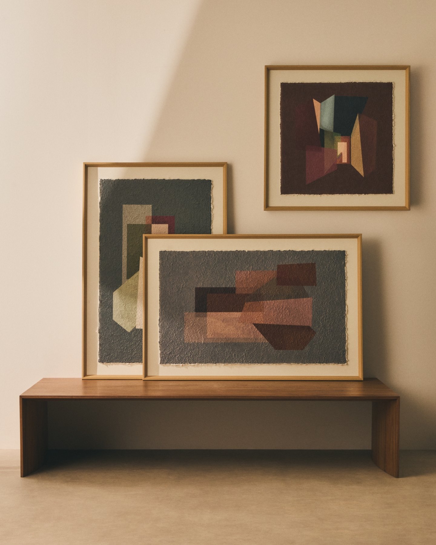 Эта картина вдохновлена кубизмом и архитектурой середины века. Она привносит глубину и индивидуальность в любое пространство благодаря сочетанию геометрических фигур и палитры серых и бордовых тонов. В этом дизайне архитектура деконструируется и синтезируется, чтобы отразить её в уникальном художественном произведении, где наложение плоскостей и игра прозрачности создают визуальный эффект, побуждающий к созерцанию и добавляющий нотку современной изысканности.