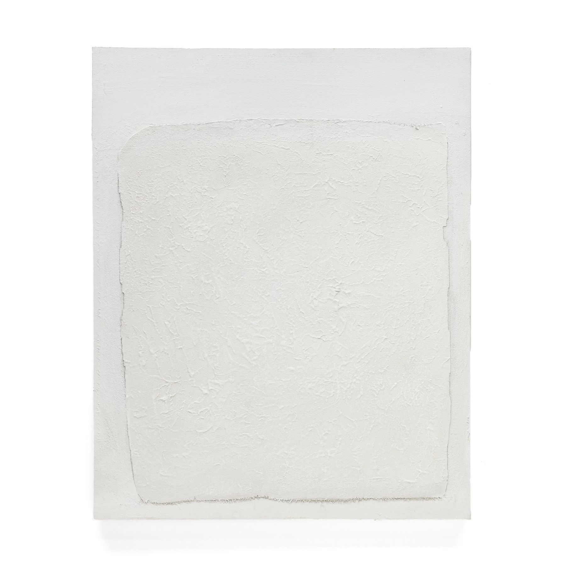 Панно прямоугольной формы. Оно сделано из холста, на котором белой фактурной краской изображена абстрактная фигура.