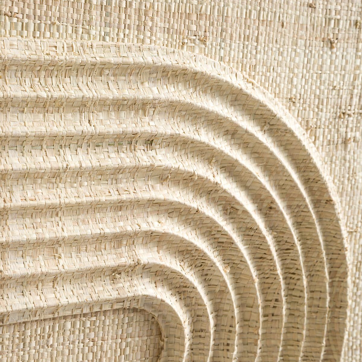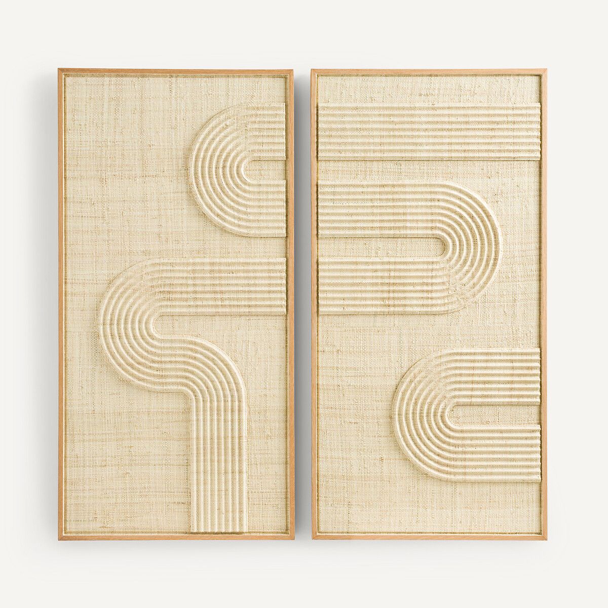 Настенные украшения Telaga представляют собой линейный принт, который продолжается от одного полотна к другому. Две картины изготовлены из сотканных вручную пальмовых листьев, нанесенных на резное панно. Ткань в этническом стиле делает каждый диптих уникальным изделием.