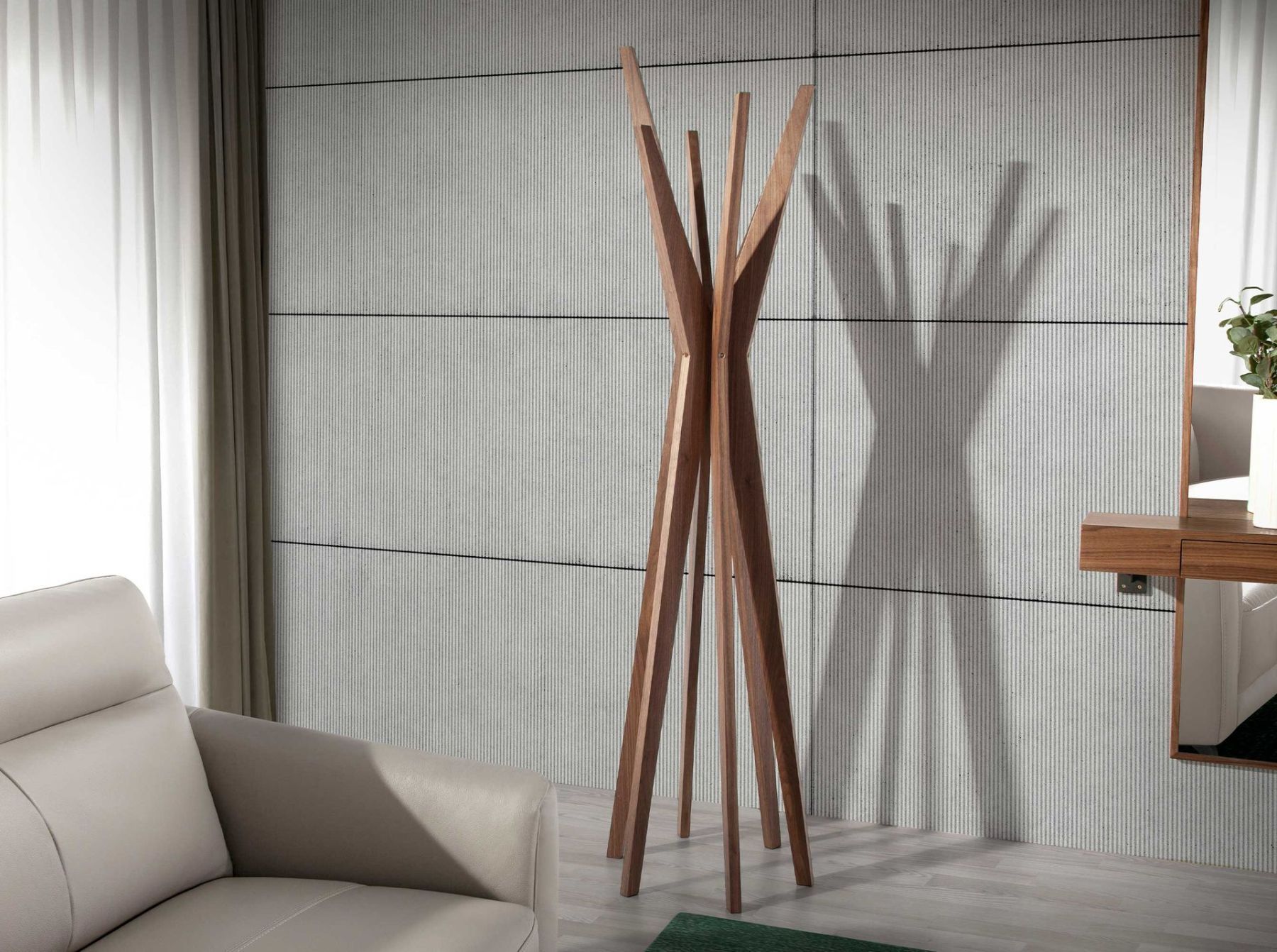 Вешалка для верхней одежды со структурой из шпона орехового дерева.