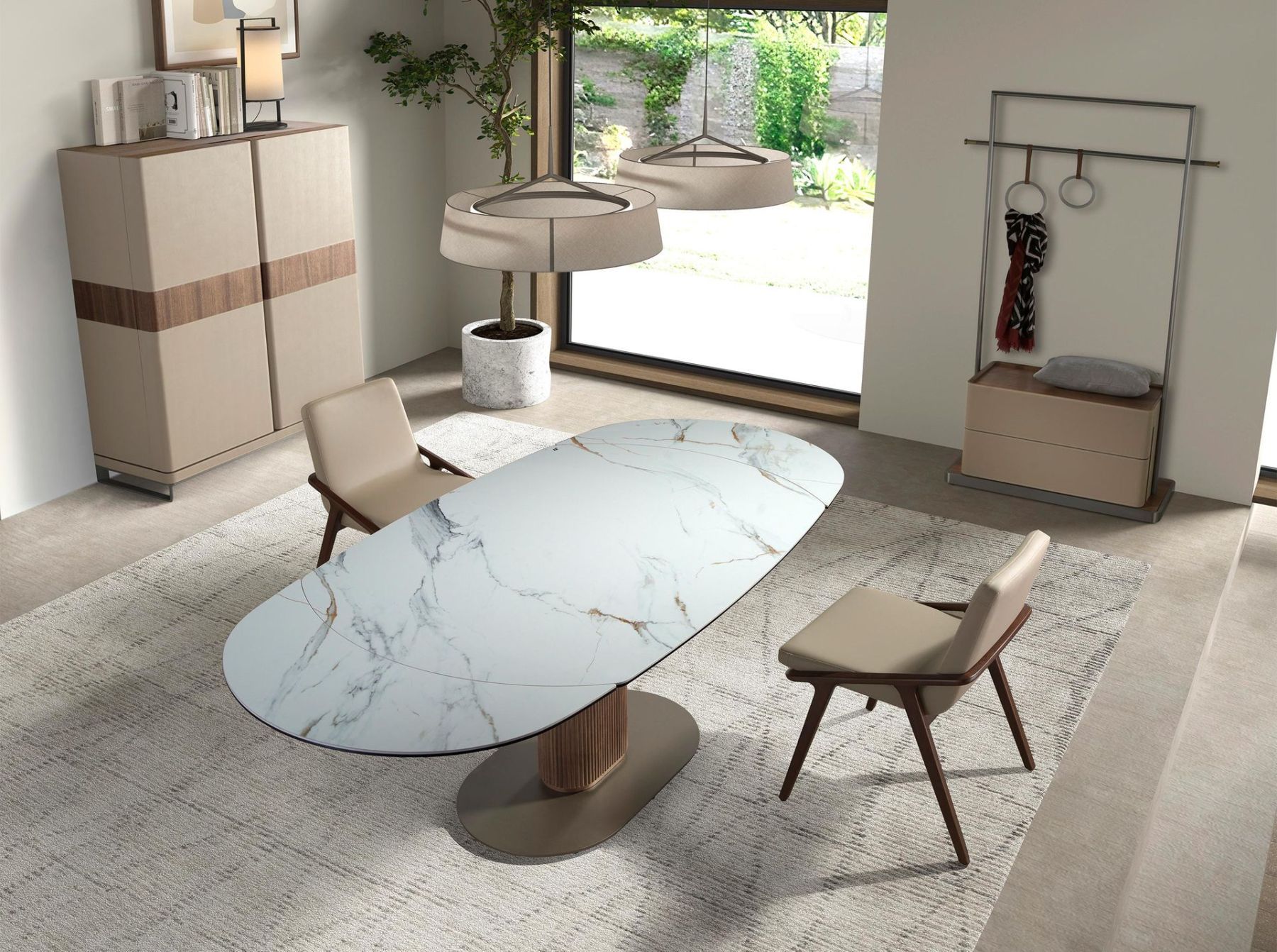 Современная вешалка для одежды из натурального орехового шпона в сочетании с элегантной обивкой из коровьей кожи цвета норки. Дизайн ее основания и структуры из полированной нержавеющей стали, а также ее полированная золотистая стальная деталь привнесут изысканный и эксклюзивный штрих в вашу комнату. Благодаря своему вместительному пространству для хранения с 2 ящиками с ручной системой открывания и системой плавного закрывания, она позволит вам держать все в порядке и на своих местах.
