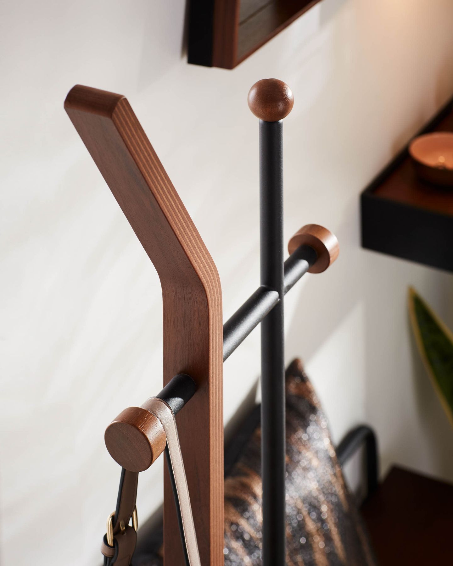 Структура вешалки Magali состоит из шпона дуба с отделкой из орехового дерева с правой стороны и окрашенной в черный цвет матовой черной краской слева. Вы можете повесить свое пальто, пиджак и аксессуары с обеих сторон. Основание также выполнено из черного металла, что придает изделию устойчивость.