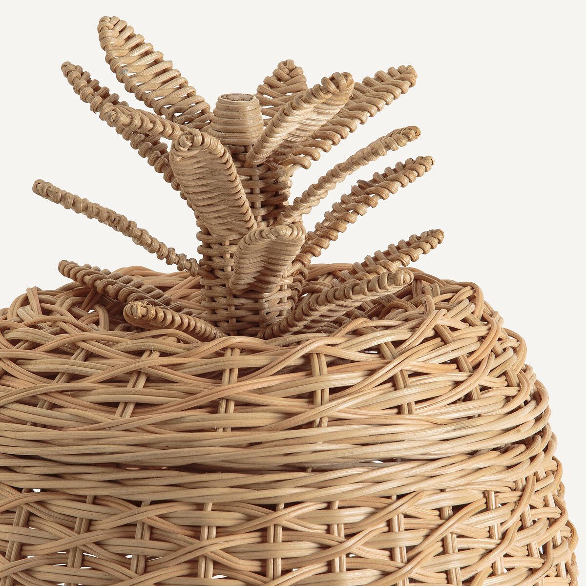 Форма ананаса для экзотической нотки и крышка для скрытного хранения игрушек, пледов или небольших предметов. Из плетеного ротанга.