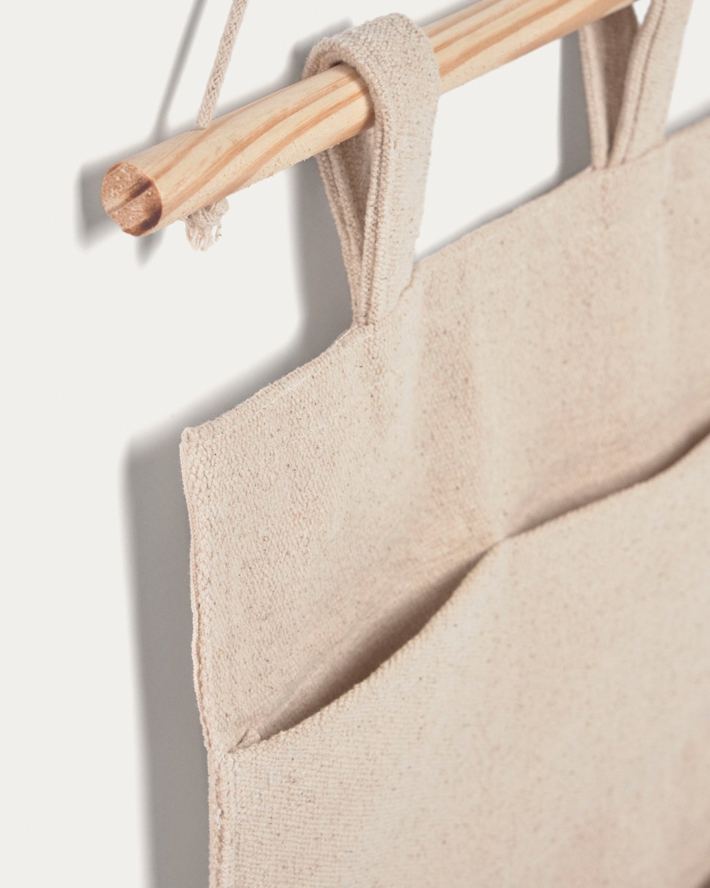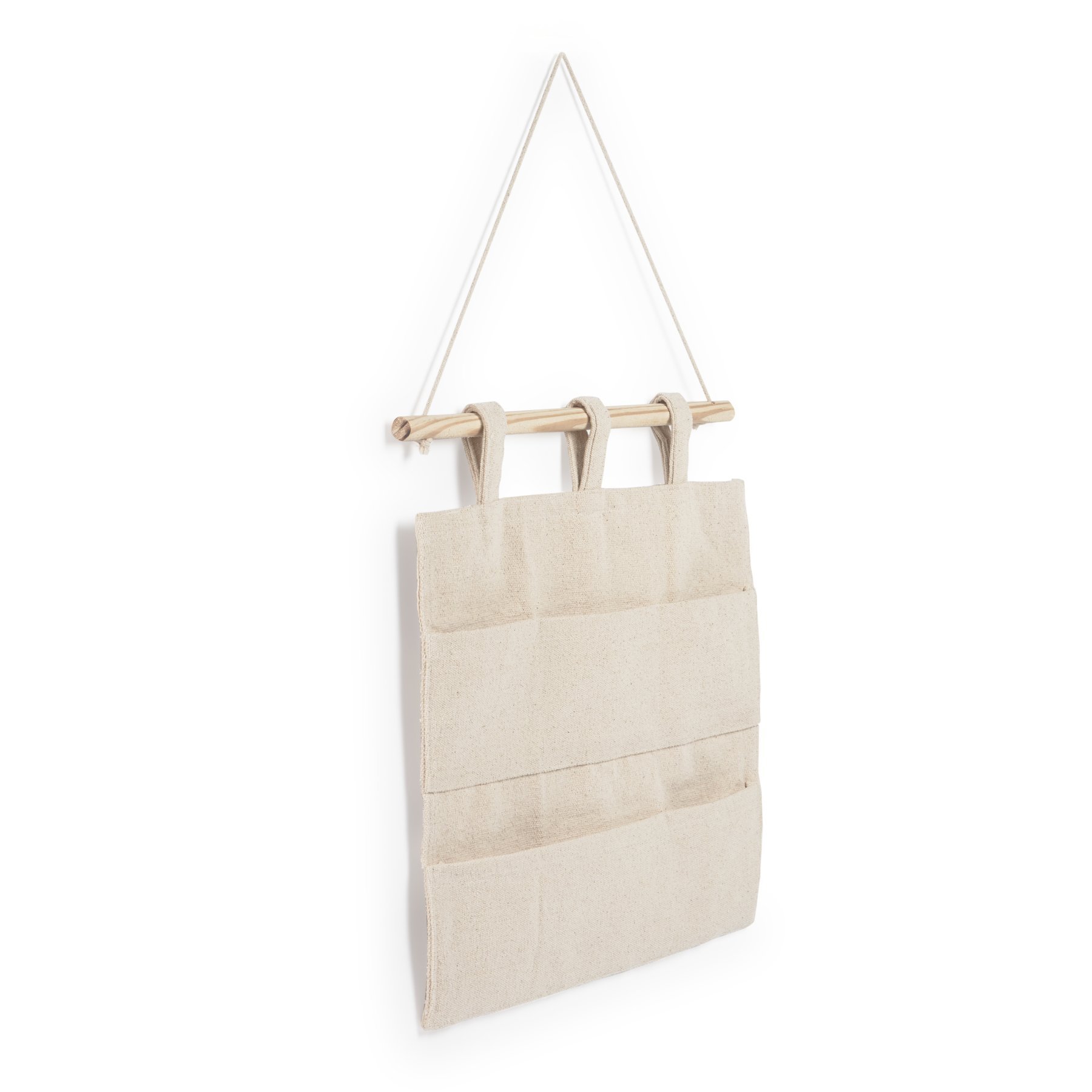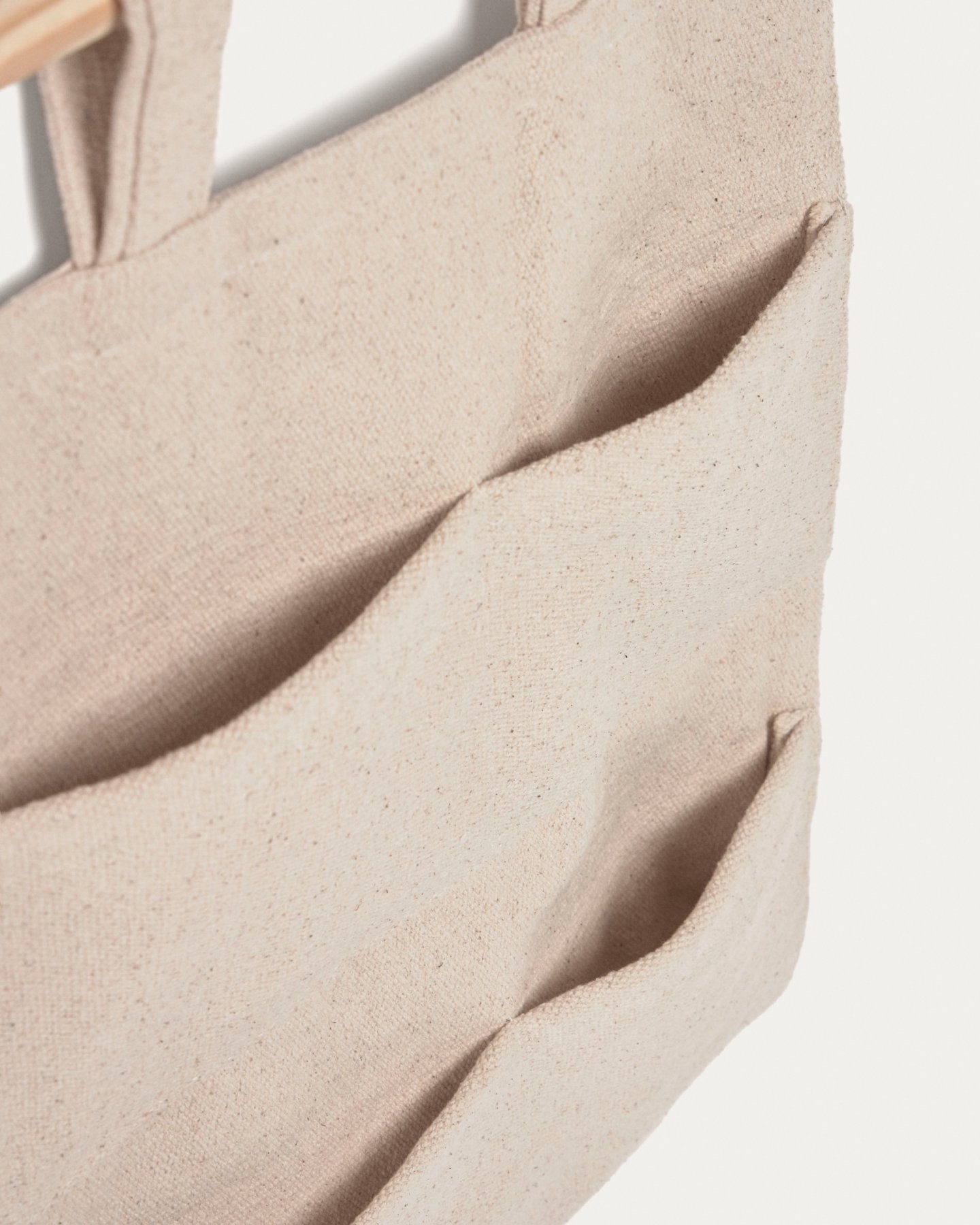 Органайзер сшит из хлопковой ткани натурального светло-бежевого цвета. Он имеет шесть одинаковых карманов для хранения шириной 16,5 см.