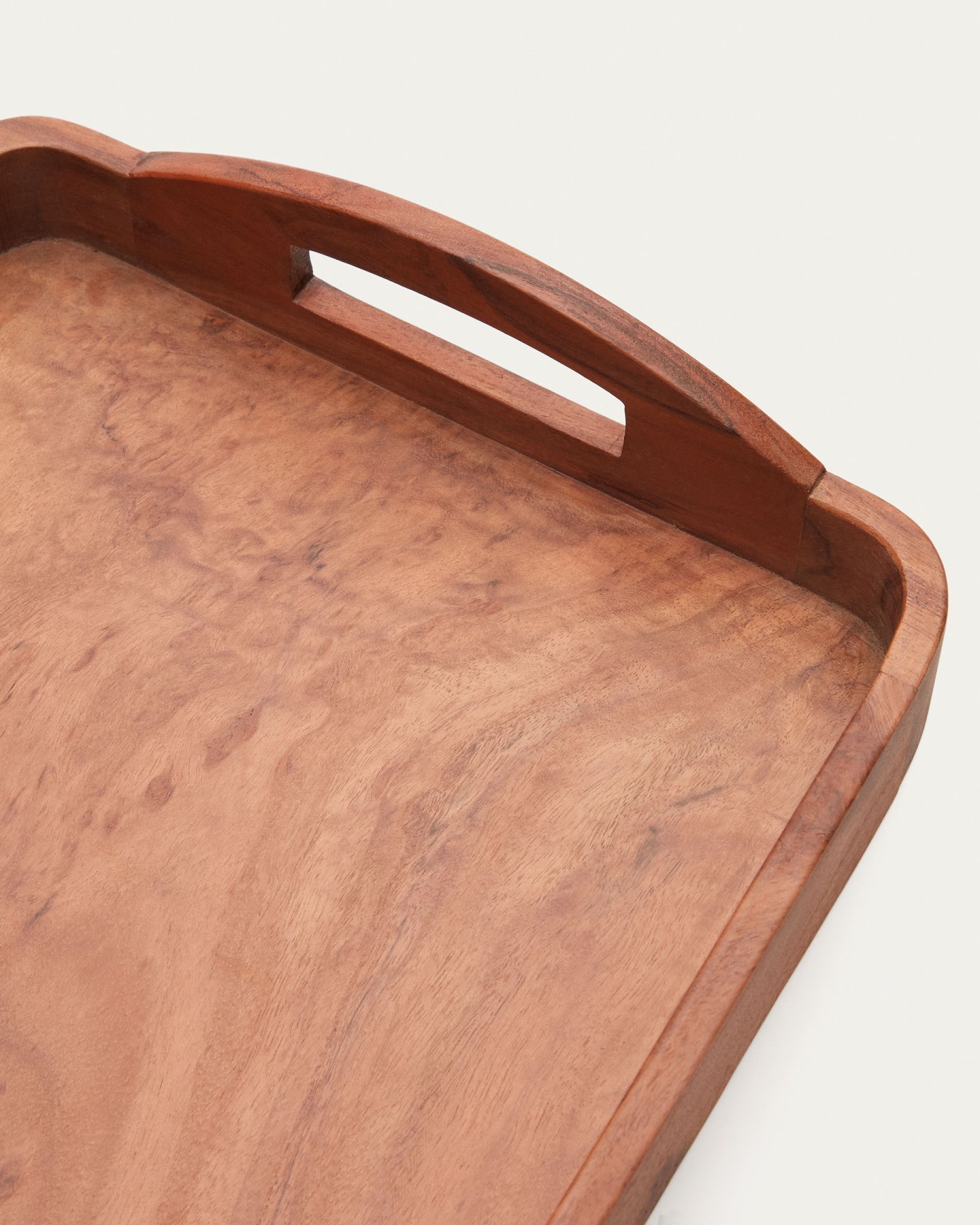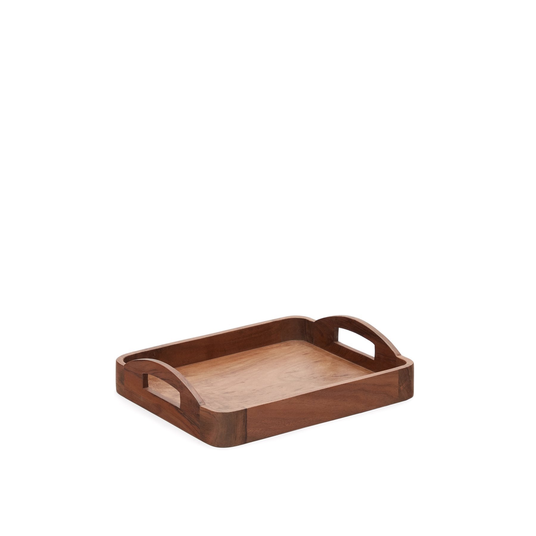 Поднос прямоугольной формы с бортиками по всему контуру и ручками для удобного переноса. Он сделан из древесины акации в натуральной отделке. Сверху полиуретановое прозрачное покрытие, которое защищает массив от негативного воздействия влаги и солнца.