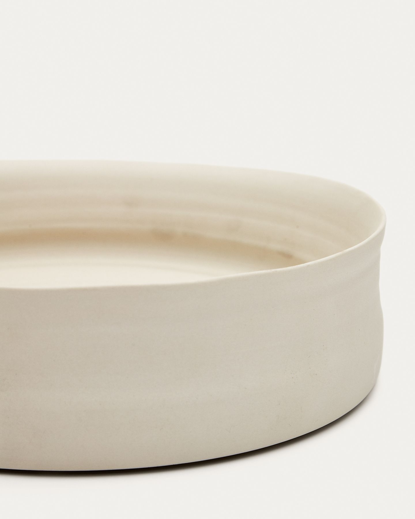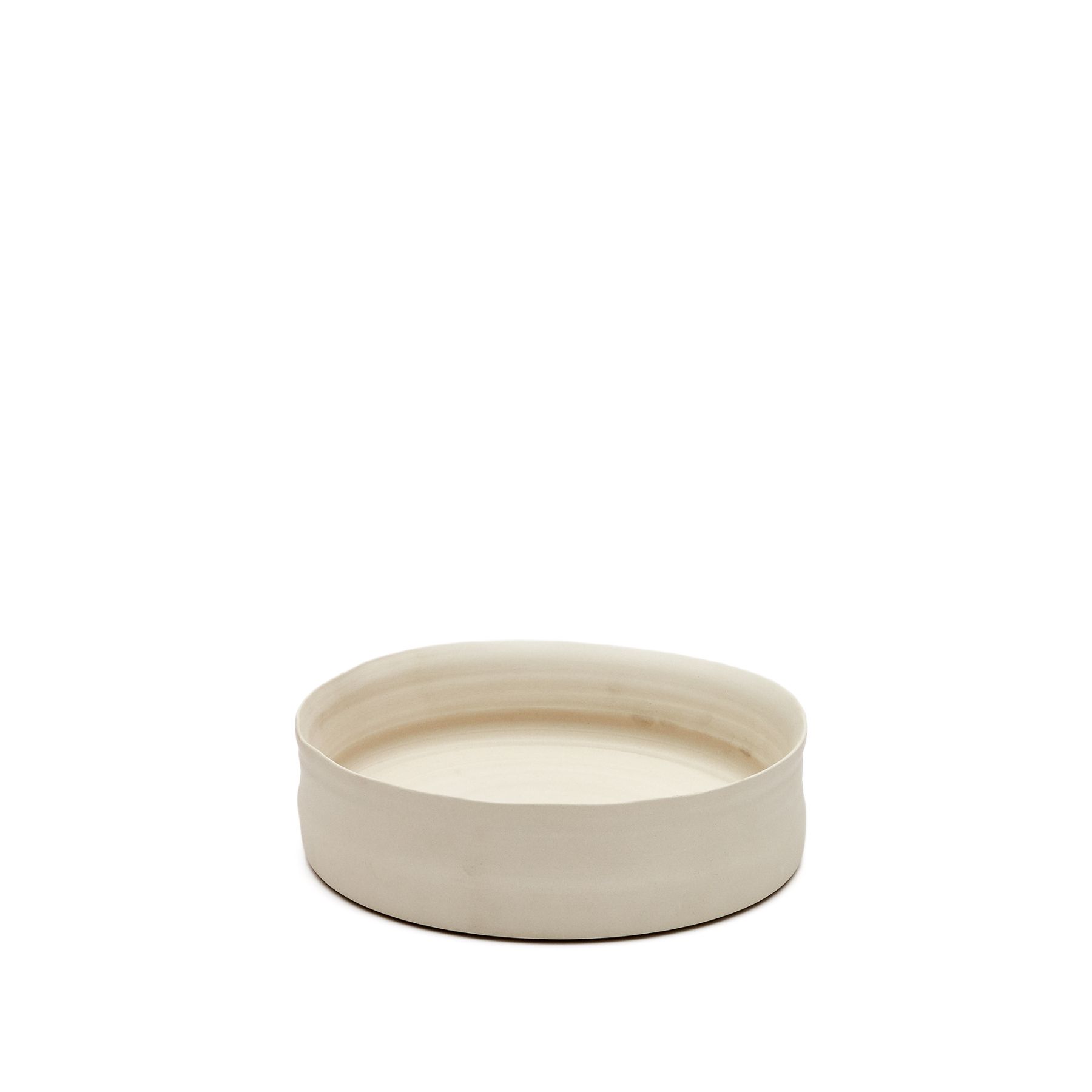 Поднос имеет круглую форму, полностью сделан из керамики белого цвета. Неоднородный цвет в сочетании неидеальной фактурой и формой добавляют изделию индивидуальности, что безусловный плюс для сервировки или декора интерьера.
