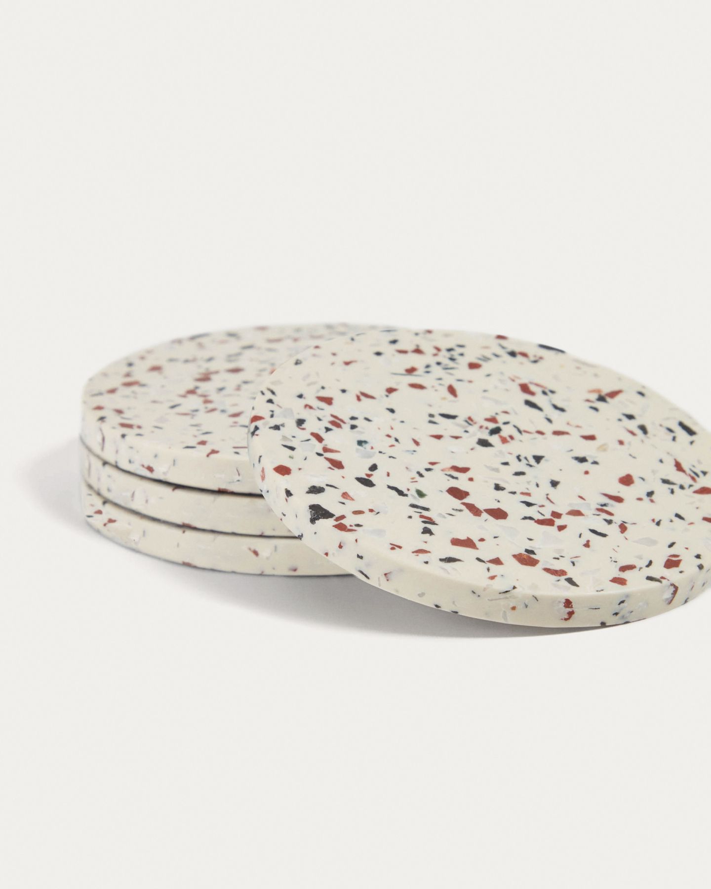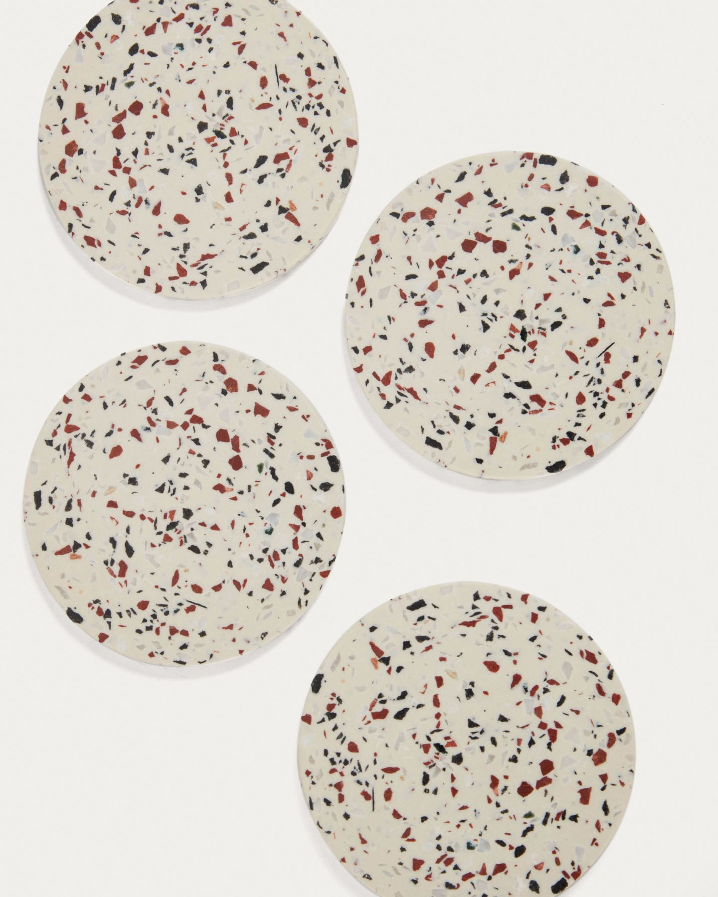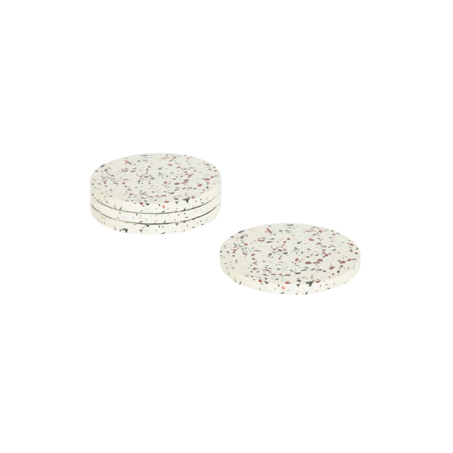 Круглые подставки под кружки из терраццо белого цвета. Каждая подставка Tiana сделана из натуральных материалов, поэтому уникальна и имеет свой неповторимый оттенок. В наборе 4 шт. Диаметр 10 см, толщина 0,8 см.