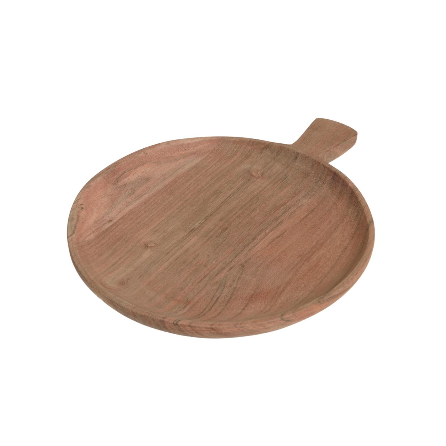 Круглый поднос из массива акации с натуральной отделкой. Обратите внимание на уникальные тона и текстуры. Хотя он не подходит для посудомоечной машины, его легко мыть вручную.