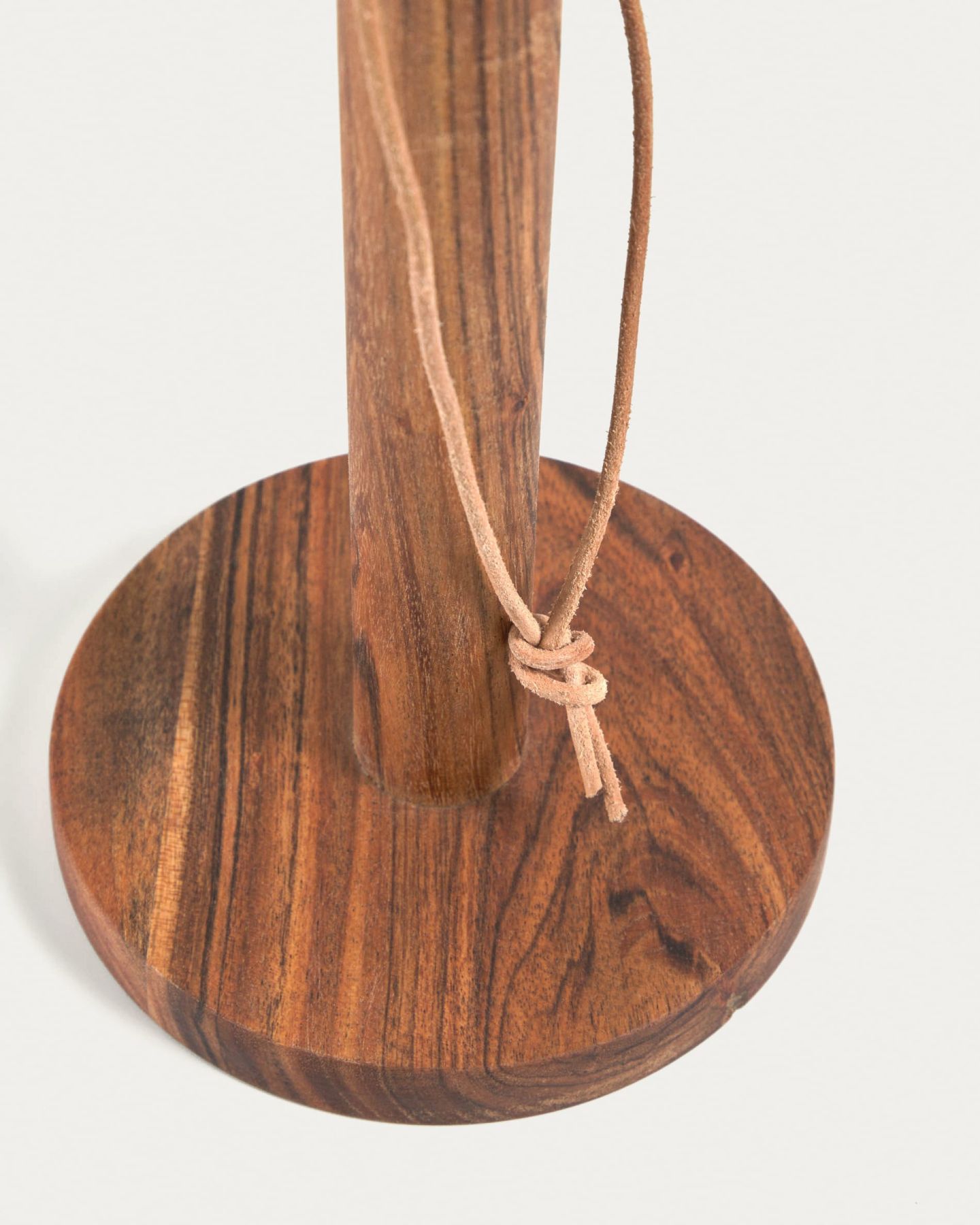 Круглое основание подходит для полотенец стандартного размера. Оно имеет толщину в два с половиной сантиметра, благодаря чему изделие будет устойчиво даже на неровной поверхности. Для удобного переноса или подвеса, сверху есть петля из натуральной кожи.