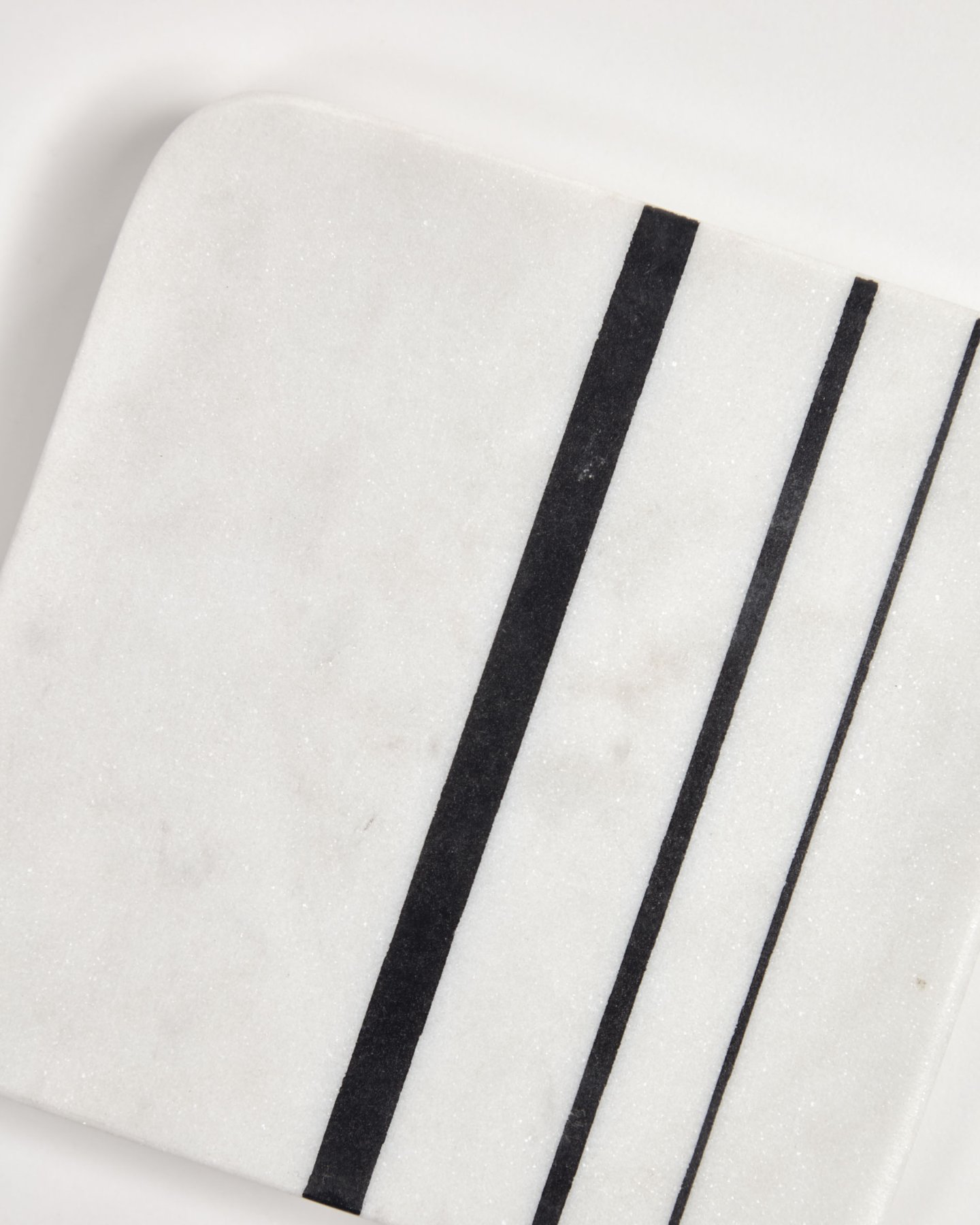 Набор состоит из четырех квадратных подставок одинаковых по размеру. Материал изготовления – черно-белый натуральный мрамор. Каждая подставка уникальная – имеет неповторимые полутона и едва уловимые линии.