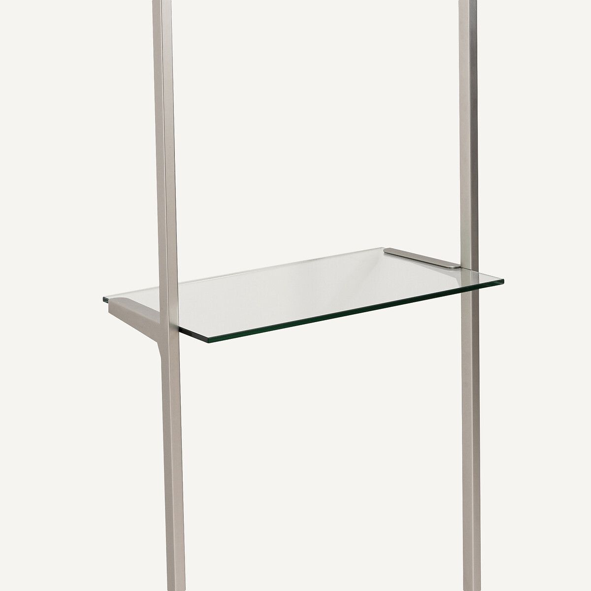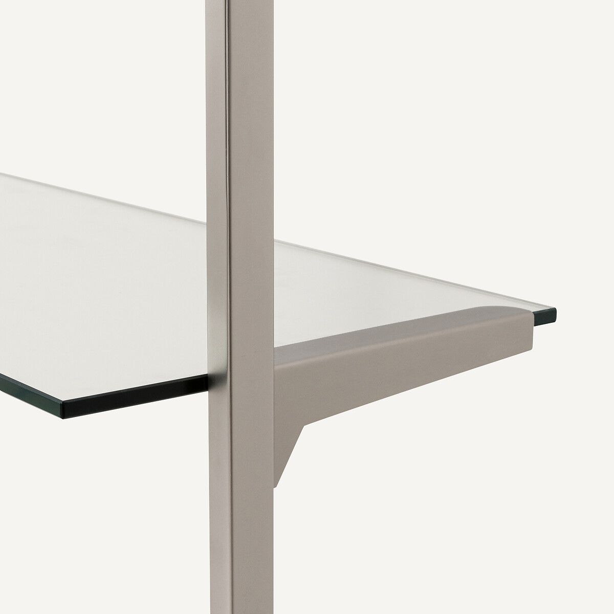 — Продается с двумя уголковыми кронштейнами из стали черного матового цвета или под блестящий никель. Крепятся к каждой полке маленьким винтом с пластиковой шляпкой (в комплекте), затем к опорам в зависимости от желаемой высоты.