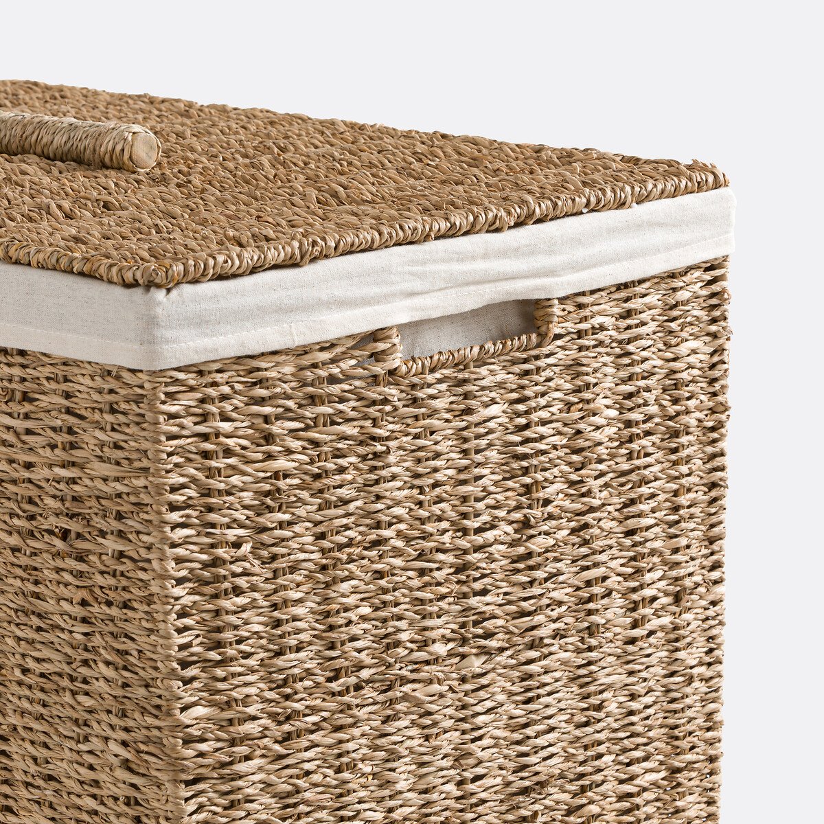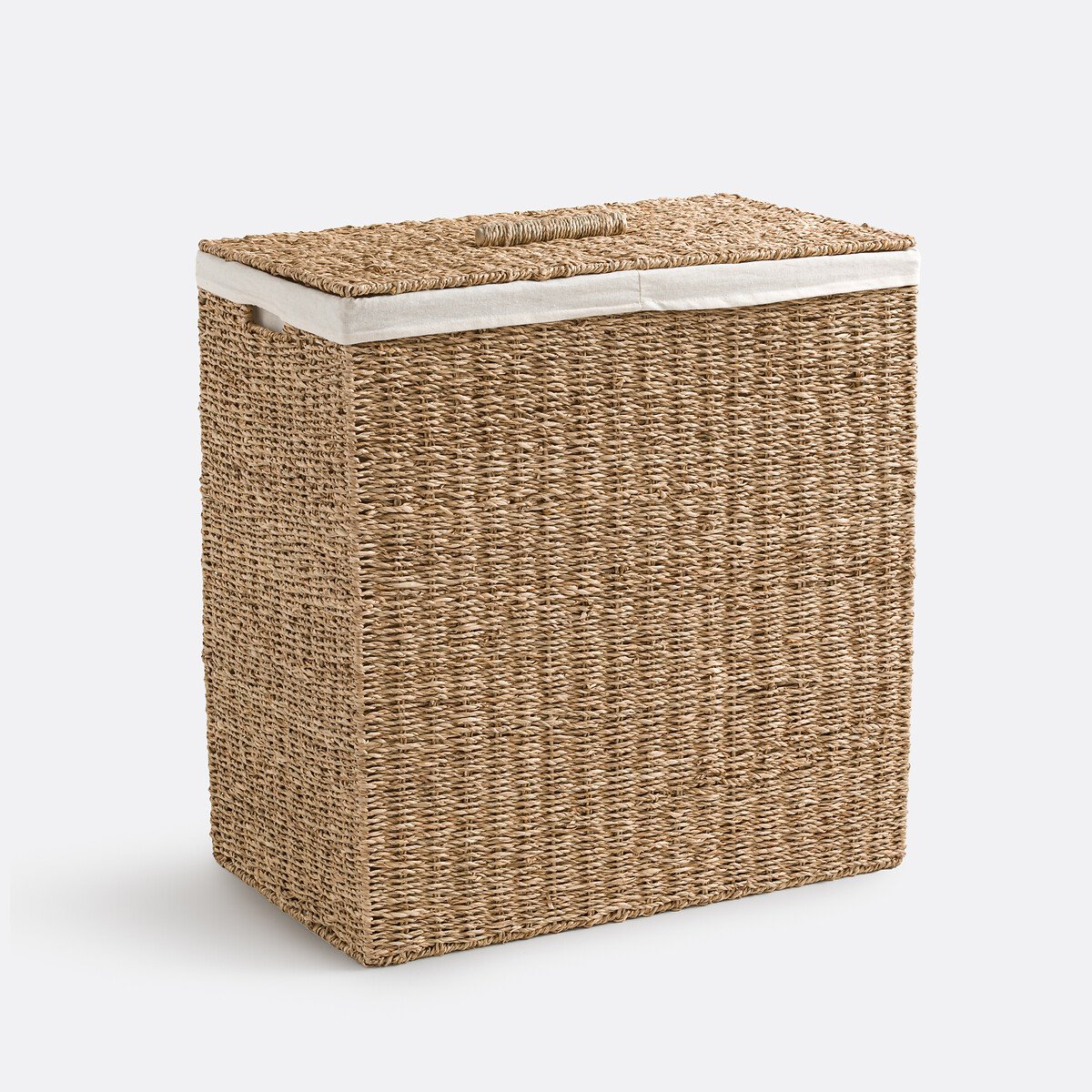 Представляем AZURO, корзину для белья из плетеной морской травы. Вам понравятся практичность ее крышки и красота ажурного плетения. Двойное отделение позволяет сортировать белье и облегчает стирку.Описание • Каркас и крышка из плетеной морской травы • Каркас из стали • Съемная внутренняя подкладка из хлопка • Двойное отделениеРазмеры • Ширина: 55 см • Высота: 58 см • Глубина: 35 смРазмеры и вес упаковкиОдна упаковка • Д67 x В41 x Г61 см, 5 кг