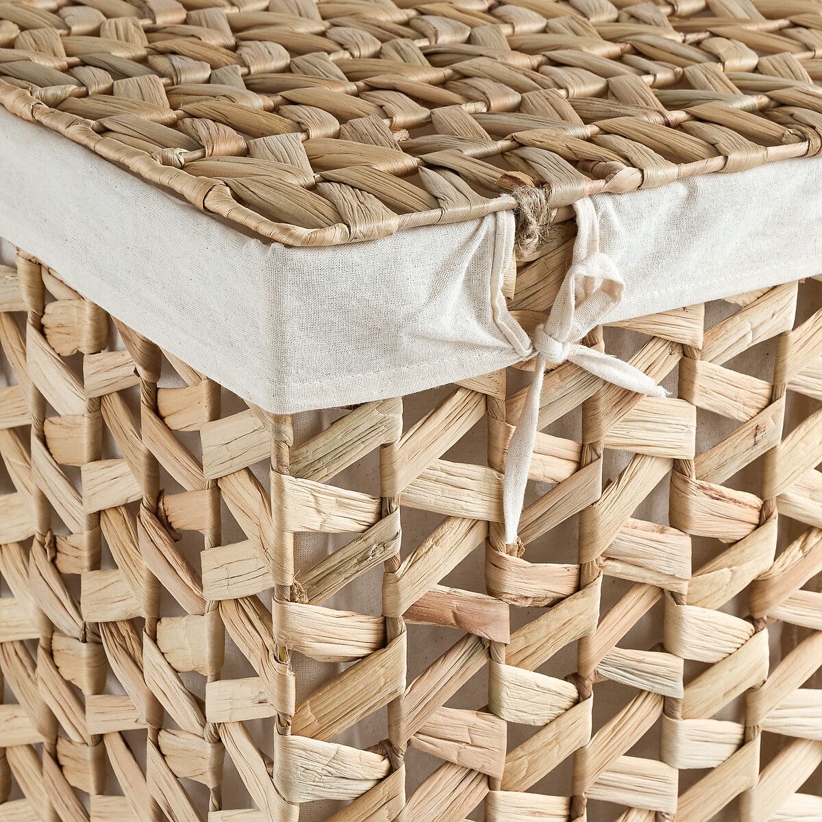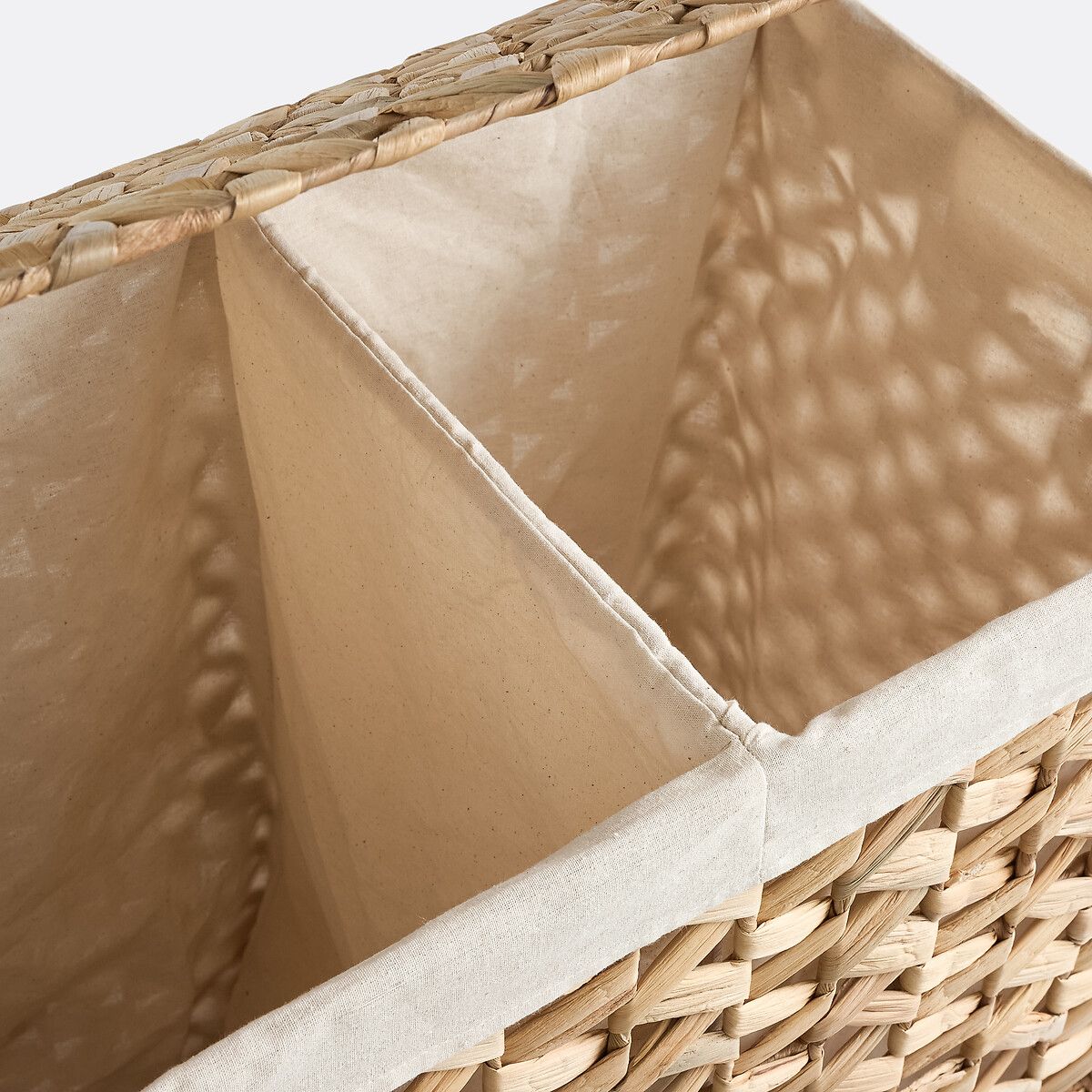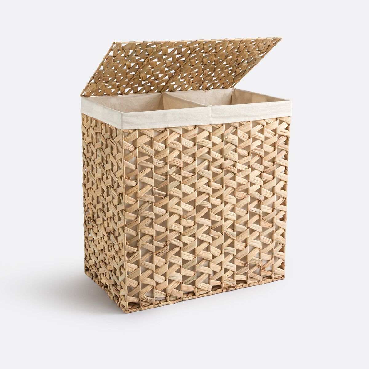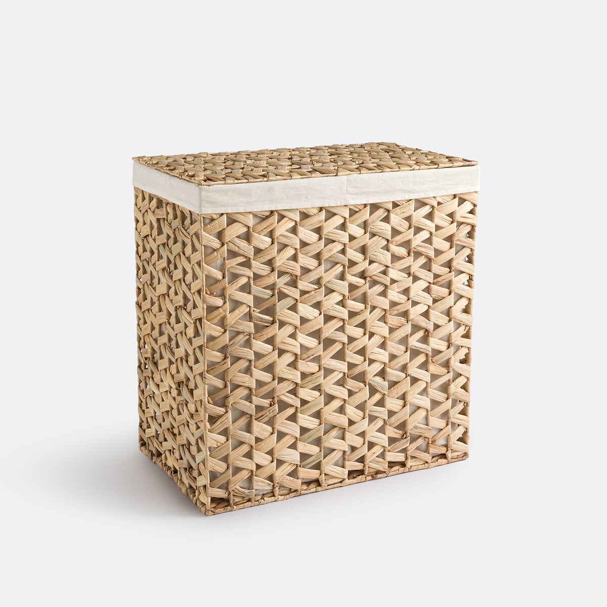 Практичная очаровательная прямоугольная корзина для белья LOMOPI. Корзина оснащена крышкой, имеет два отделения, по всему объему подкладка — идеальный контейнер для белья всей семьи.