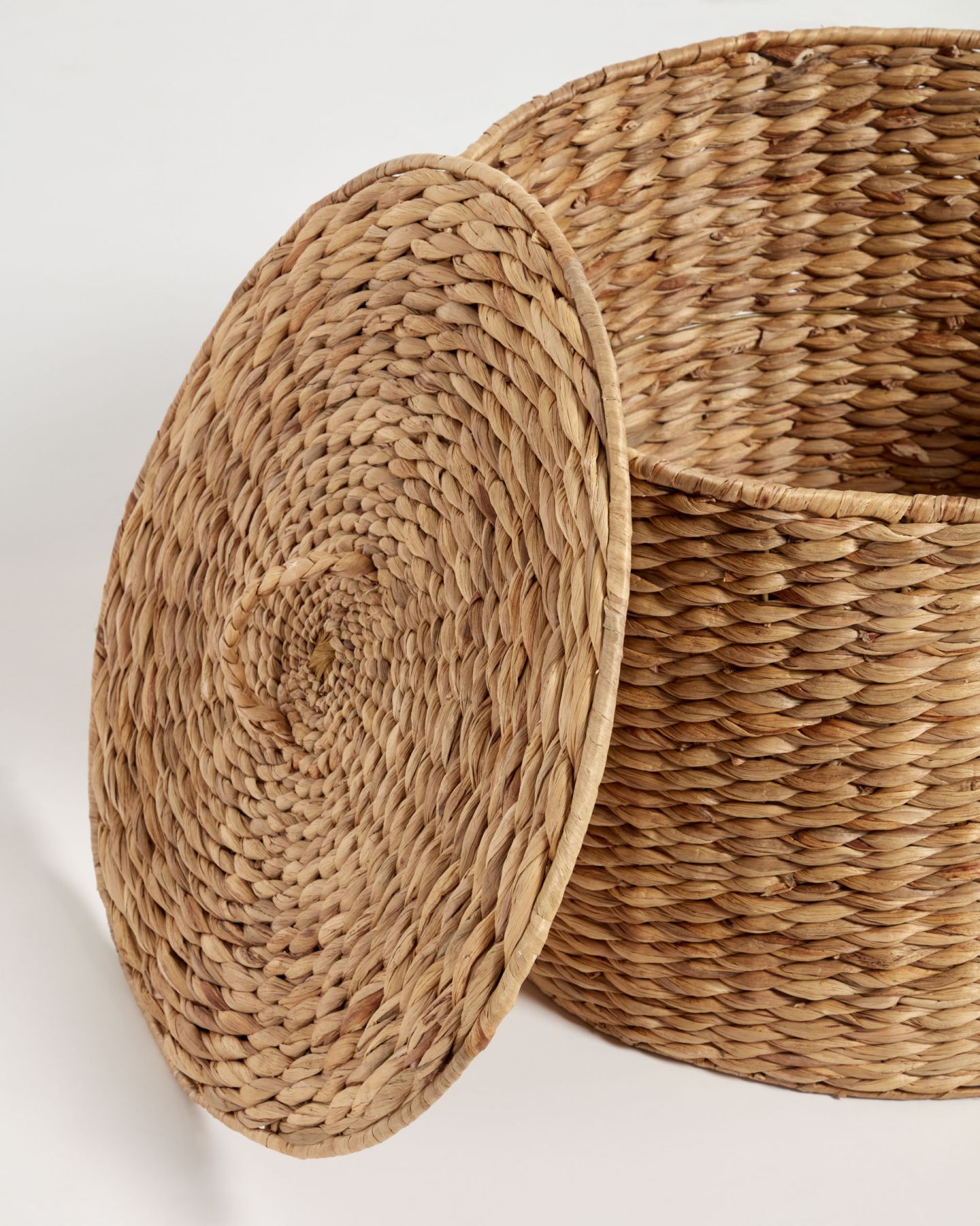 Корзина с ручками и крышкой из водного гиацинта, сотканная вручную. Изделие ручной работы, изготовленное из натуральных материалов, поэтому каждое из них является эксклюзивным, со своими оттенками и текстурами. Волокно водяного гиацинта биоразлагаемо, поэтому на нашей планете не остается отходов. Доступен в различных размерах.