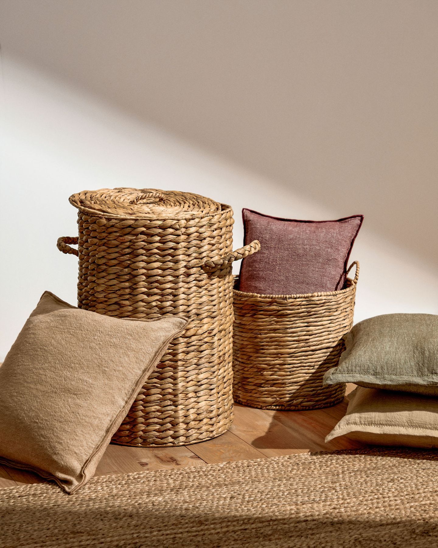 Корзина с ручками и крышкой из водного гиацинта, сотканная вручную. Изделие ручной работы, изготовленное из натуральных материалов, поэтому каждое из них является эксклюзивным, со своими оттенками и текстурами. Волокно водяного гиацинта биоразлагаемо, поэтому на нашей планете не остается отходов. Доступен в различных размерах.