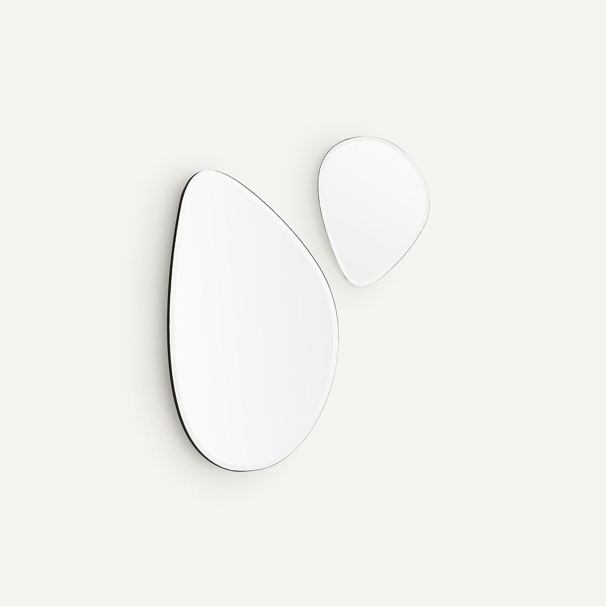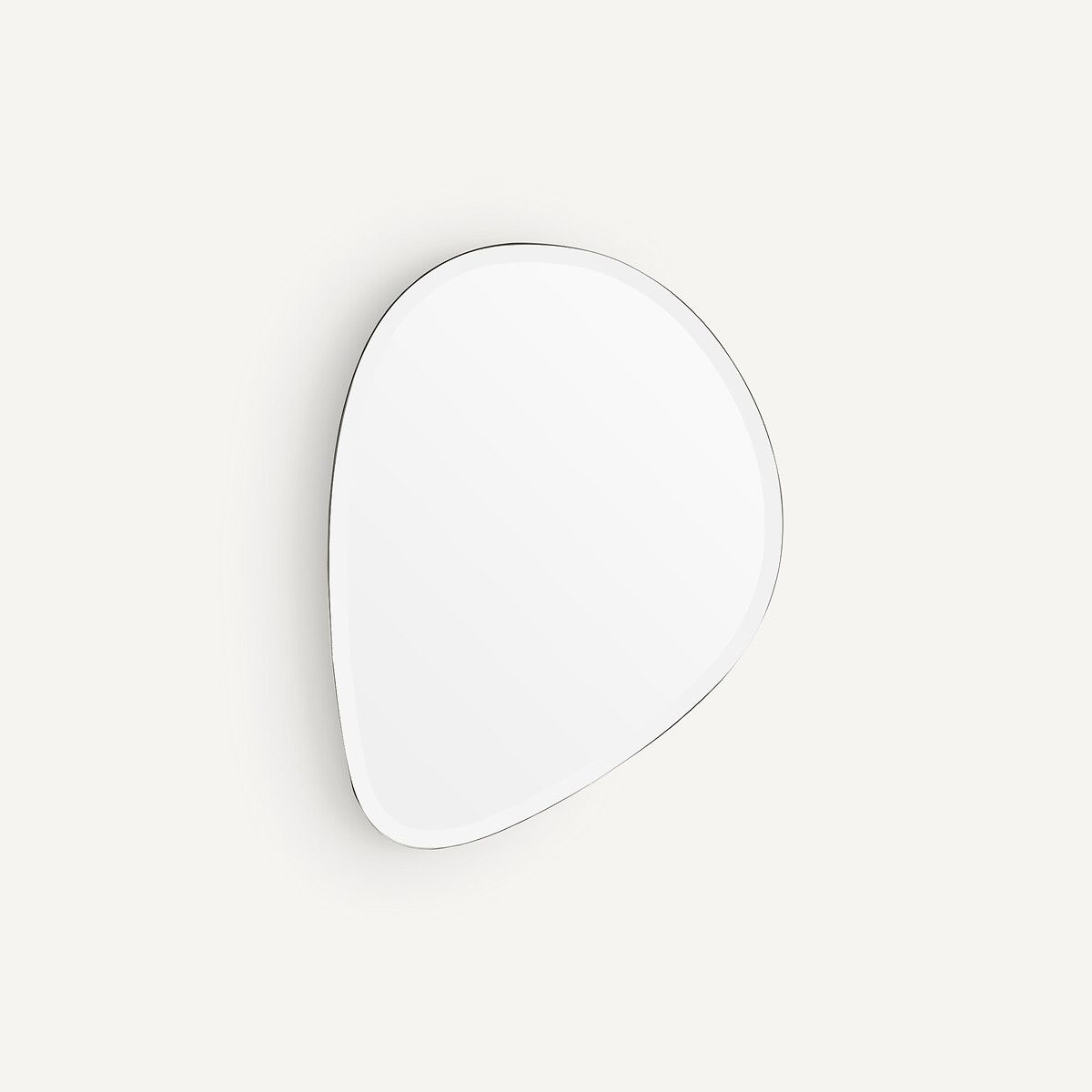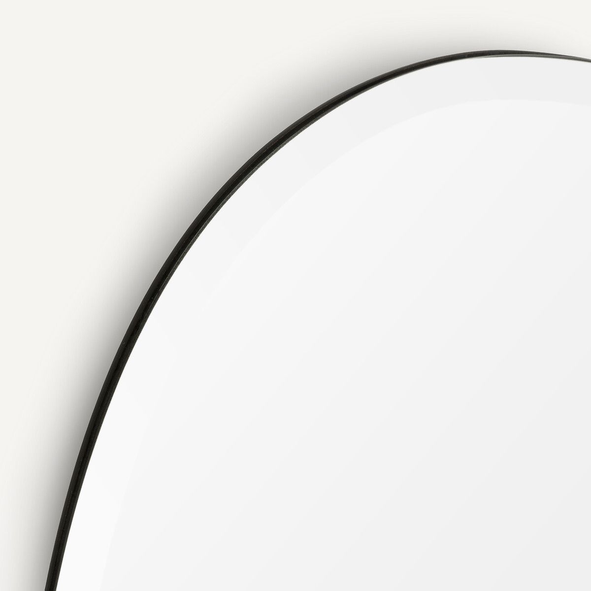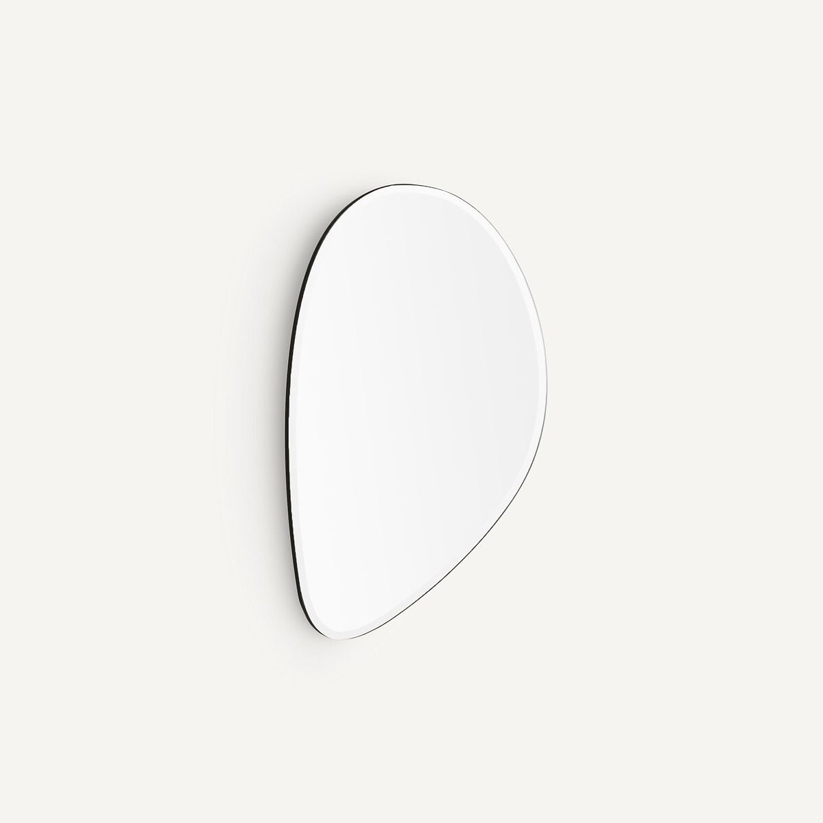 Декоративное изделие с органичными изгибами. Его яйцевидная форма напоминает каплю воды, подвешенную на стене. Зеркало со скошенными краями крепится на каркасе из МДФ черного цвета.