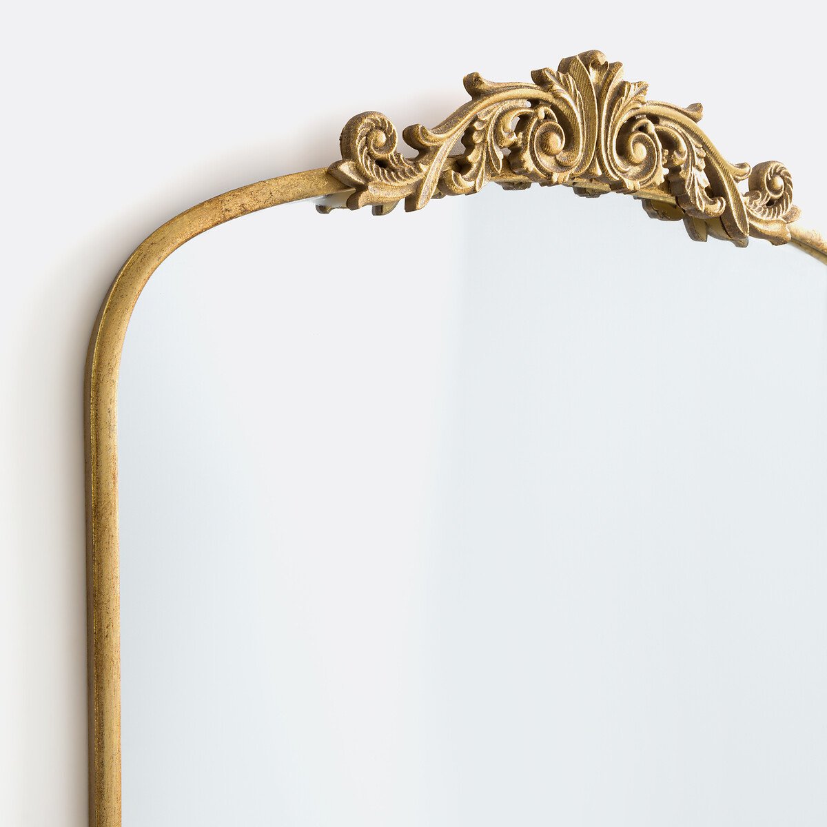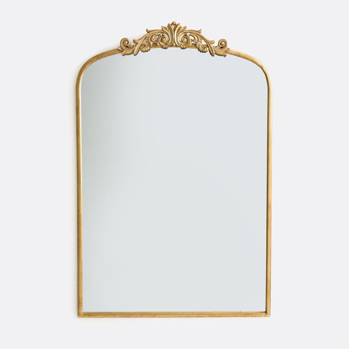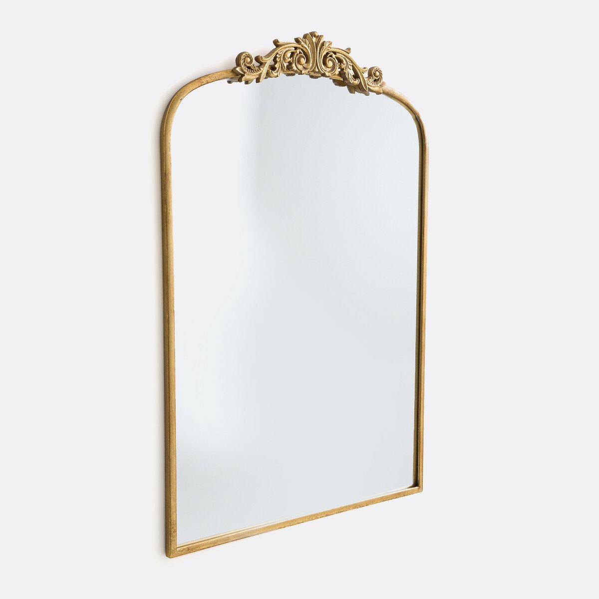 Зеркало Jinia из металла, покрытого золотистой краской под старину в стиле старинных зеркал. Резной фронтон сверху с плетеным растительным узором.