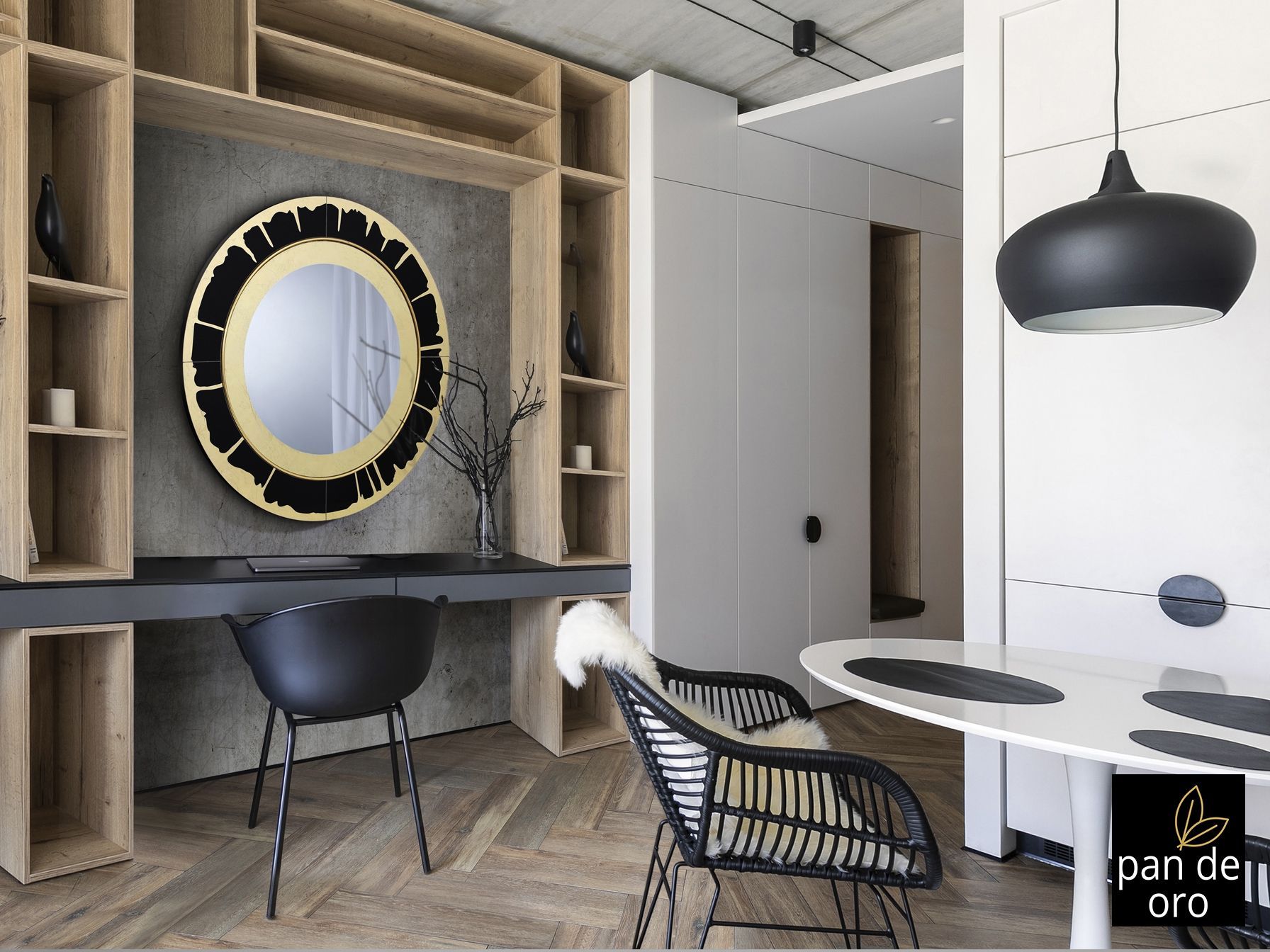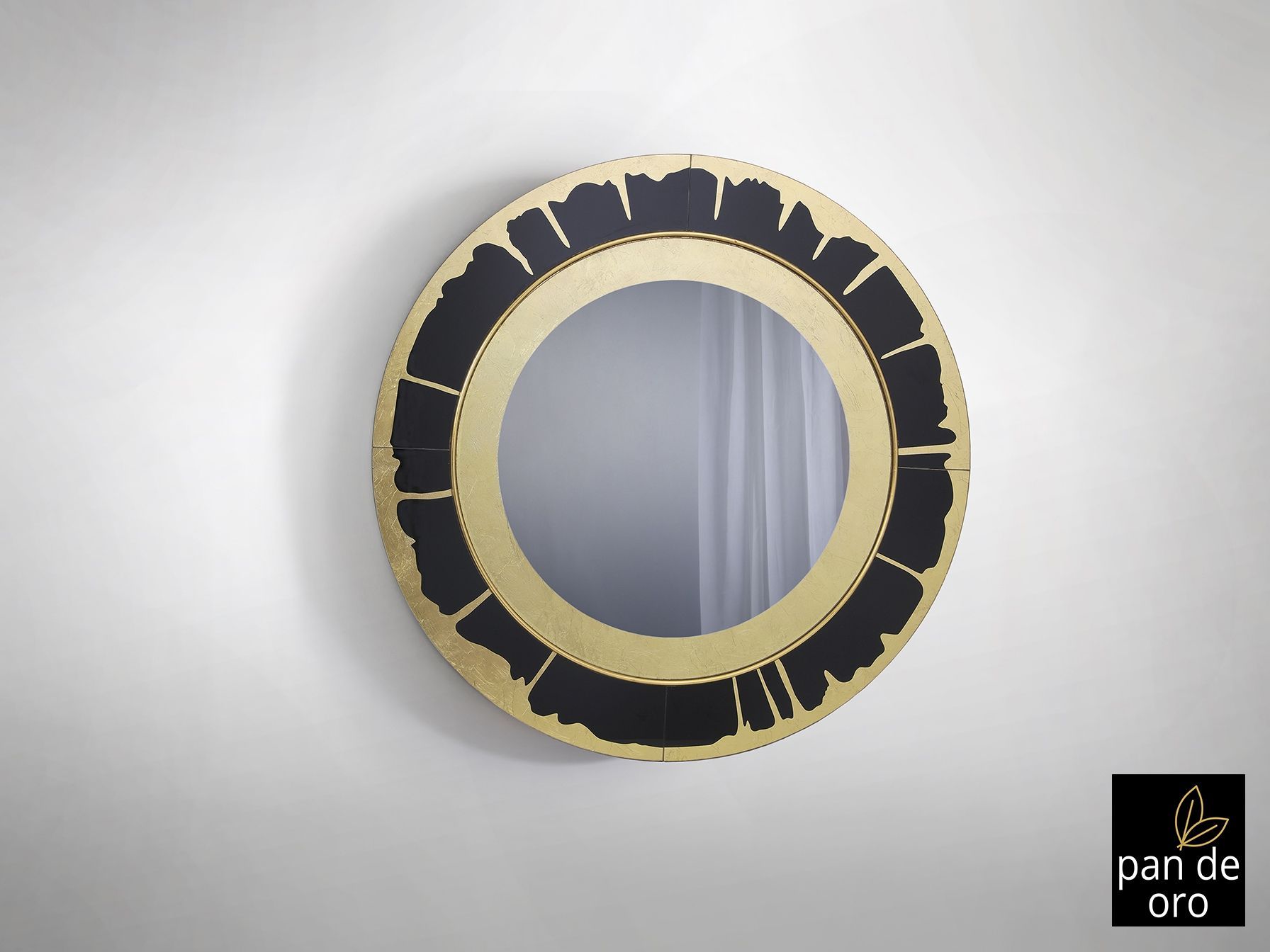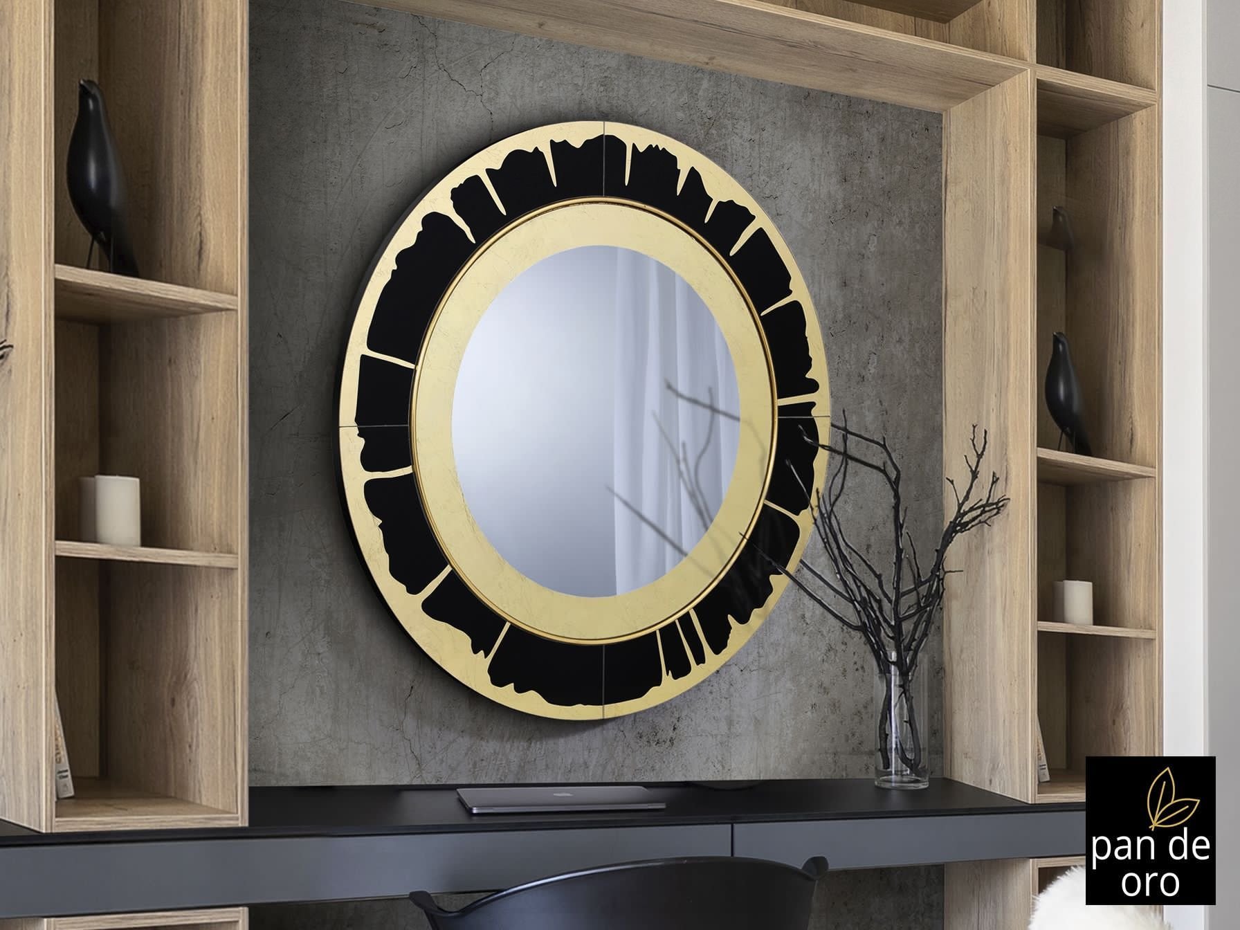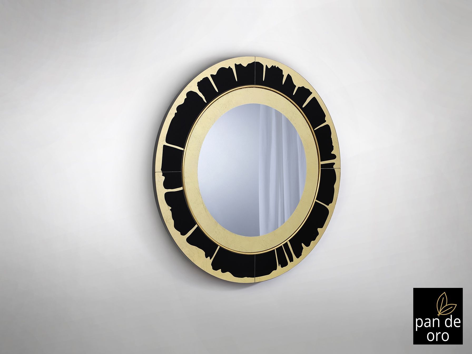 Зеркало с центральной пластиной и стеклянной рамой с деталями цвета СУСАЛЬНОЕ ЗОЛОТО и черного цвета. Задняя часть МДФ покрыта черным лаком.