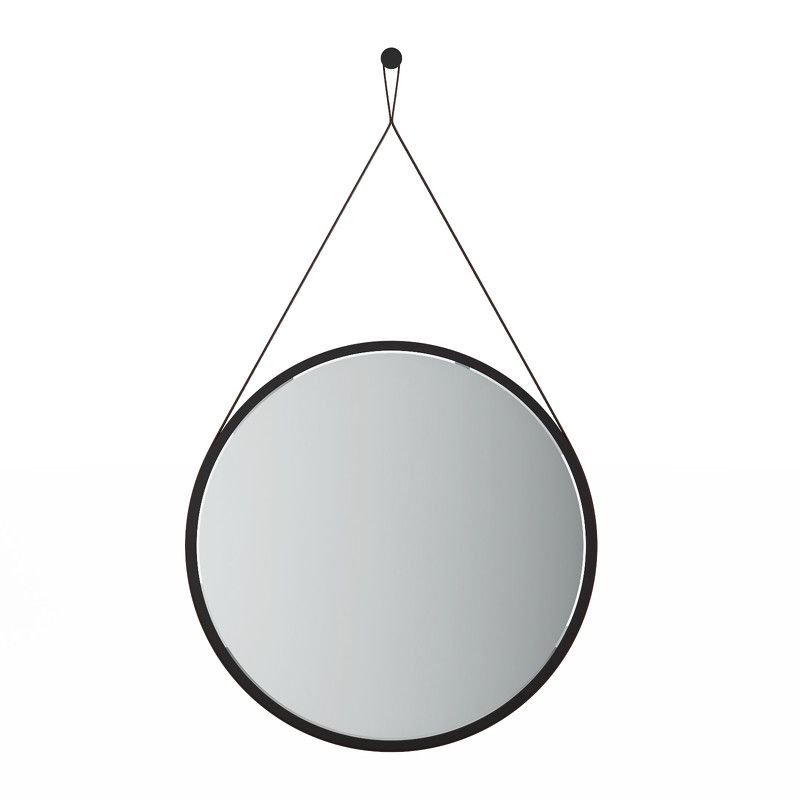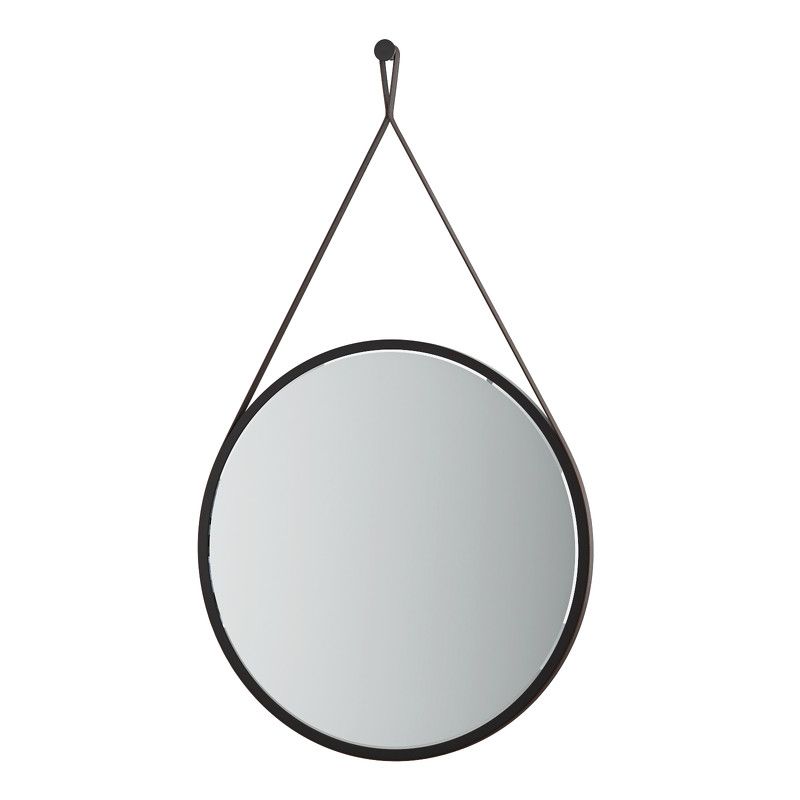 Оригинальное подвесное зеркало в круглой раме на подвесе из высококачественной эко-кожи. Крепление к стене выполнено из металла. Рама зеркала и крепление к стене окрашены в черный матовый цвет. Эко-кожа приятного коричневого оттенка.