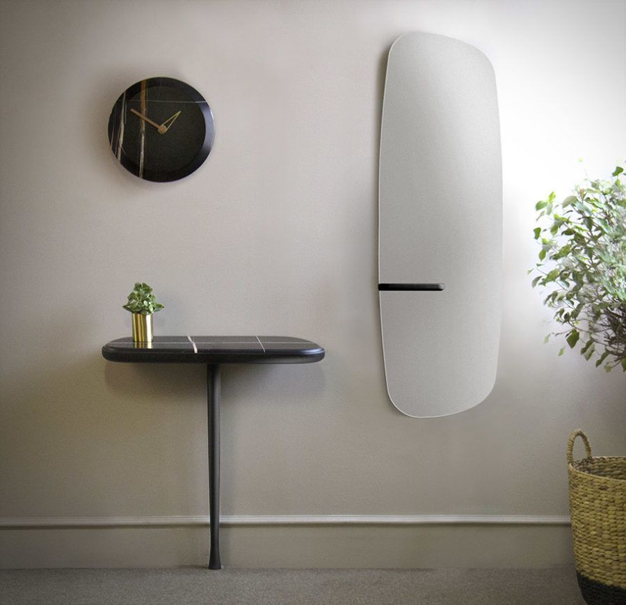 Настенное зеркало выделяется оригинальным подносом из натурального дерева с мягкими линиями, выполненными вручную.