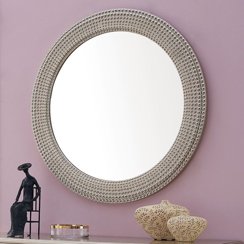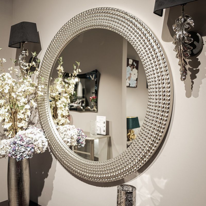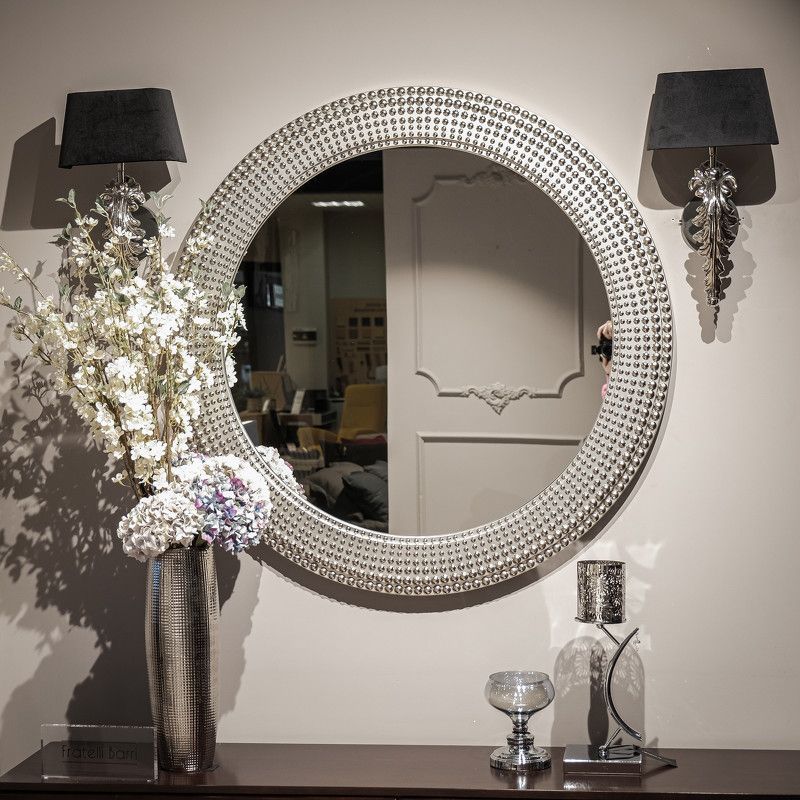 Круглое зеркало от итальянского бренда Fratelli Barri с эффектной рамой - имитацией бусинок разного диаметра.
