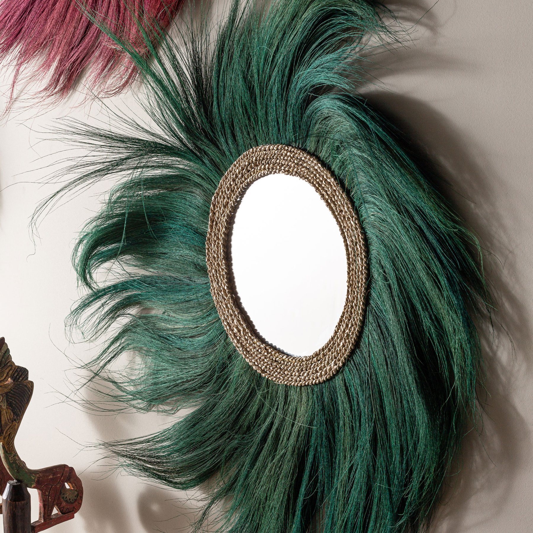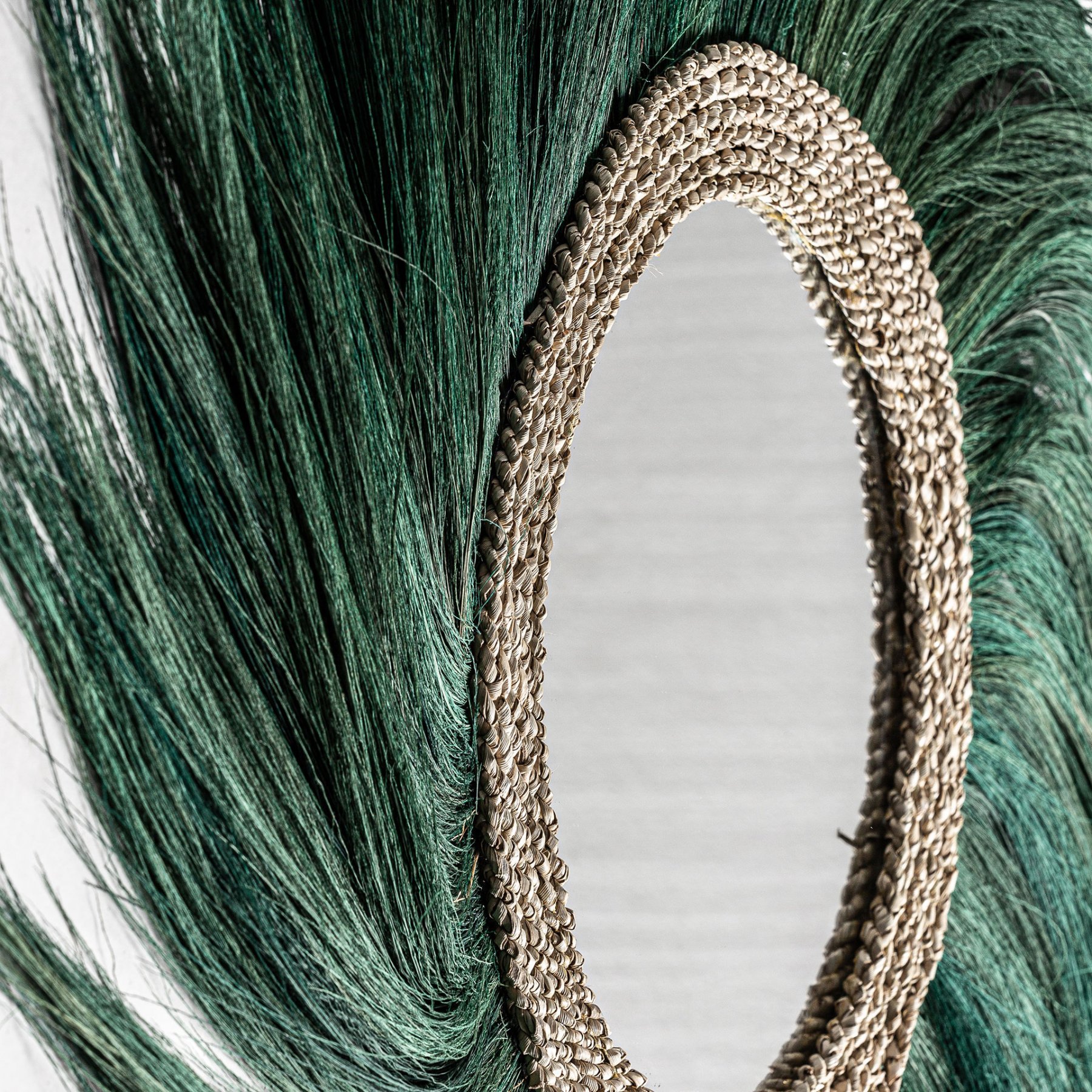 Зеркало SINKO, цвет зеленый, этнический стиль. Изготовлен из натурального волокна в сочетании с зеркалом.