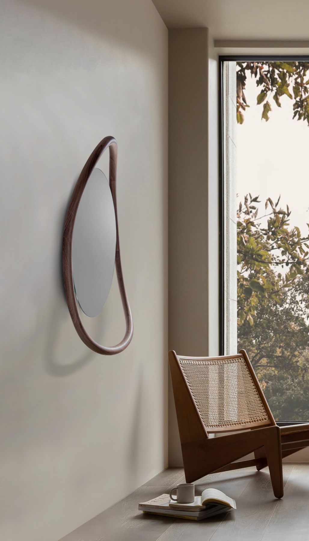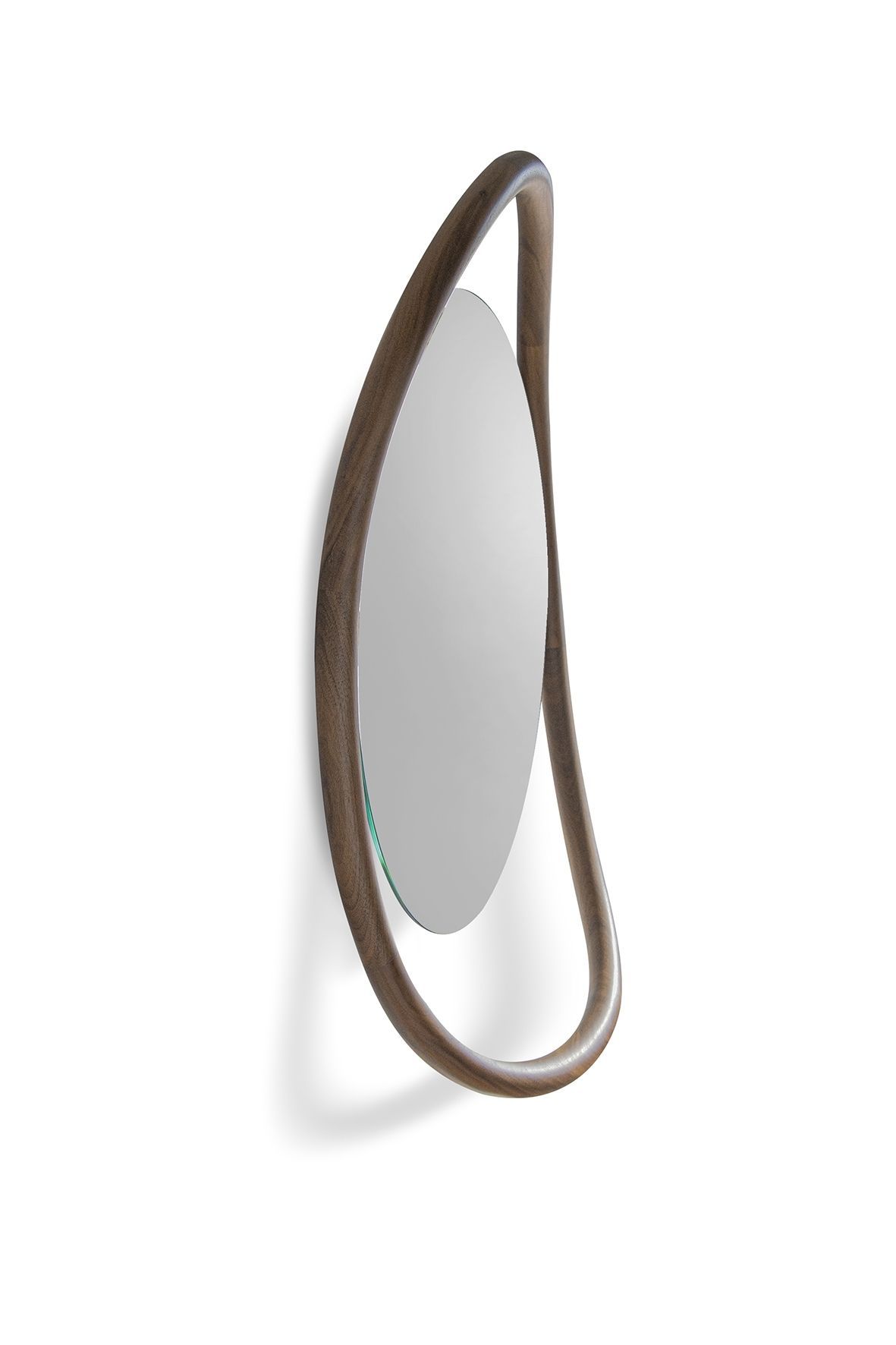 Оригинальное зеркало с изогнутой рамой из натурального дерева грецкого ореха, обрамляющее зеркало, создавая объем, напоминающий природу.