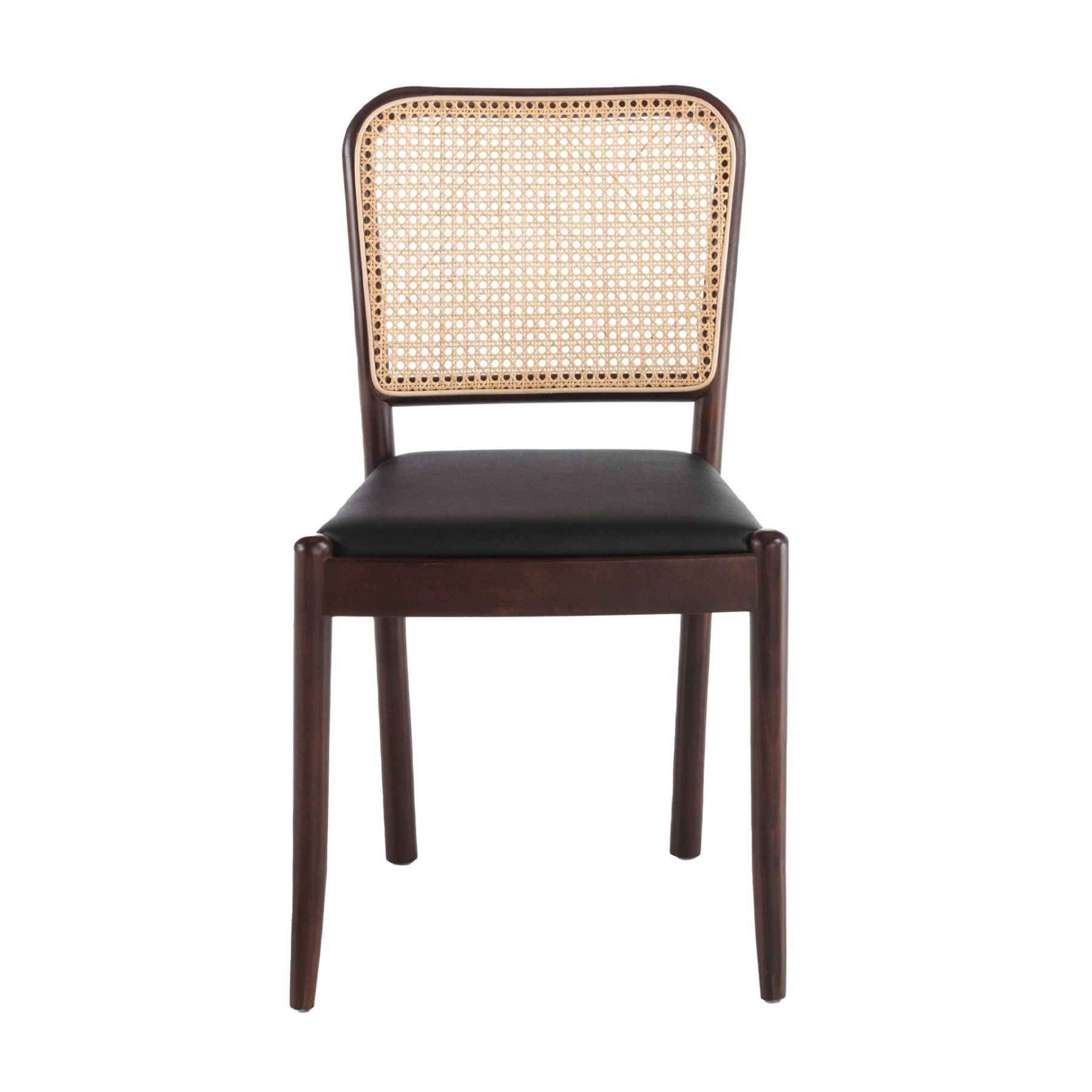 Стул из массива ясеня, окрашенный в цвет орехового дерева. Сиденье обито черным кожзаменителем, спинка из ротанга. Сиденье заполнено вспененным полиэфиром плотностью 25 кг / м3.