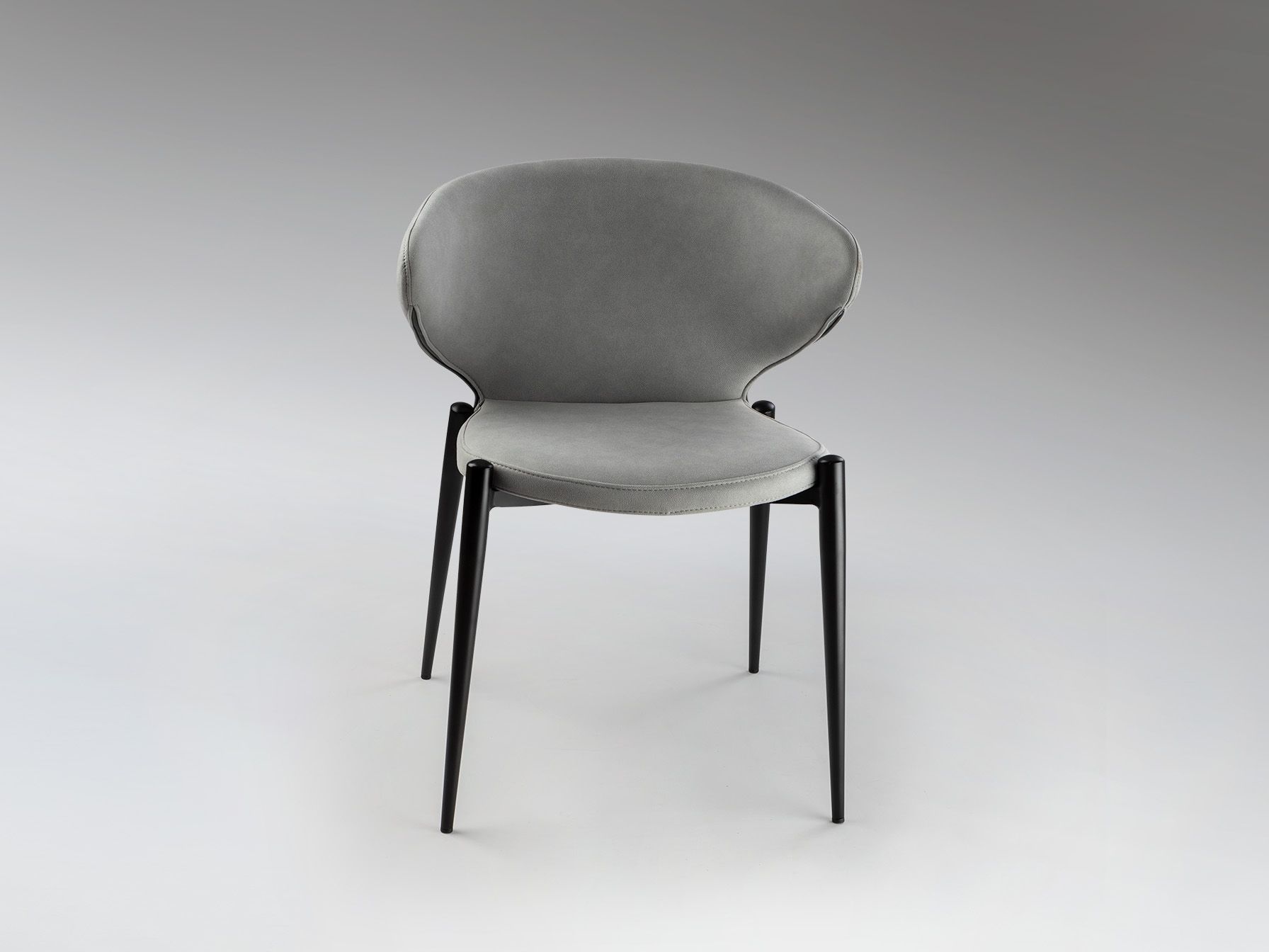 Стул из металла, матово-черная отделка. Сиденье и спинка из фанеры и поролона. Обивка из 100% полиэстера светло-серого цвета. Химчистка.