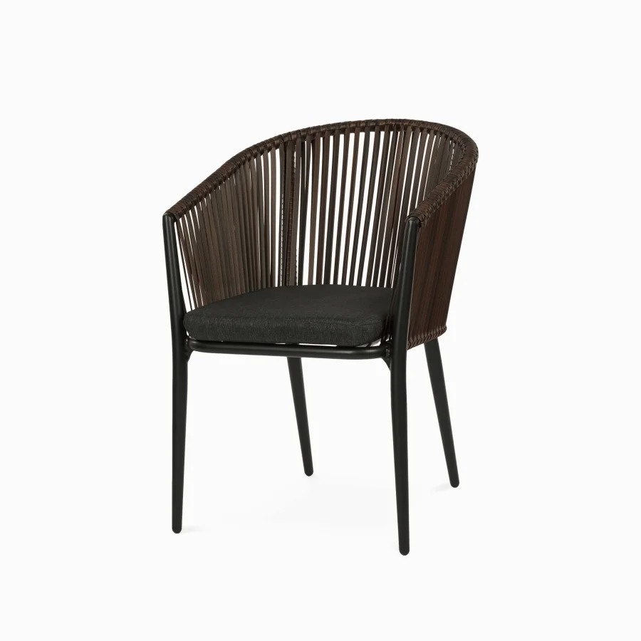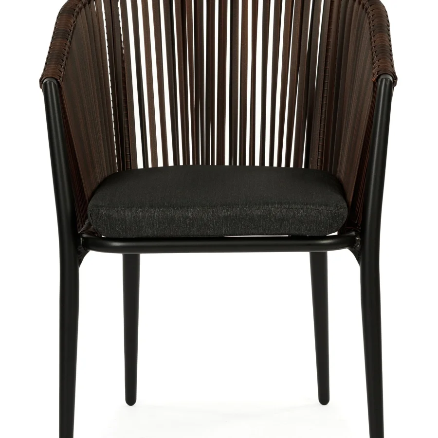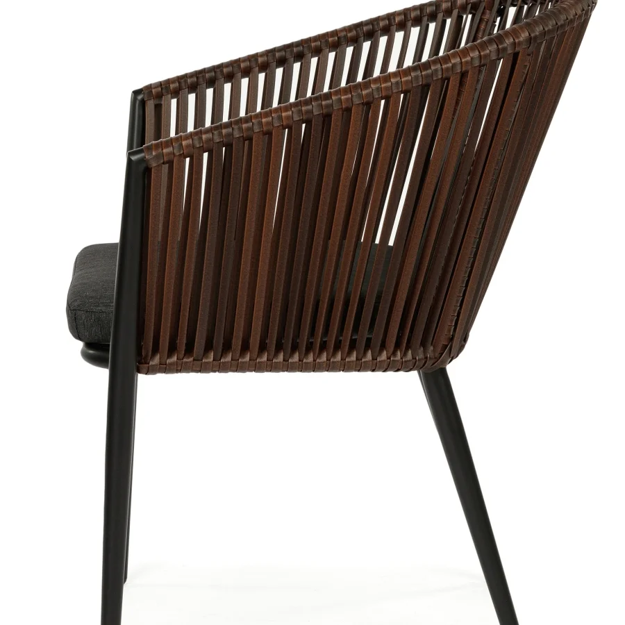 Стул Cara выделяется своим современным дизайном с чистыми линиями и элегантными формами. Искусственный ротанг придает ему текстурированную поверхность, а водоотталкивающая ткань сиденья обеспечивает комфорт в любых условиях.