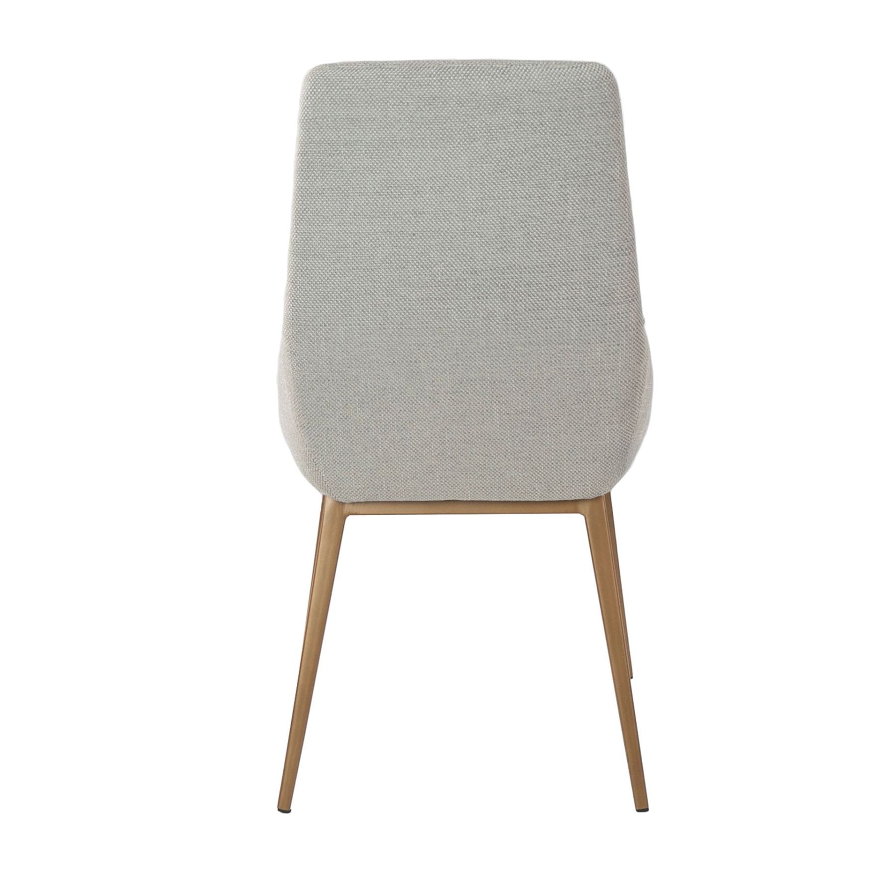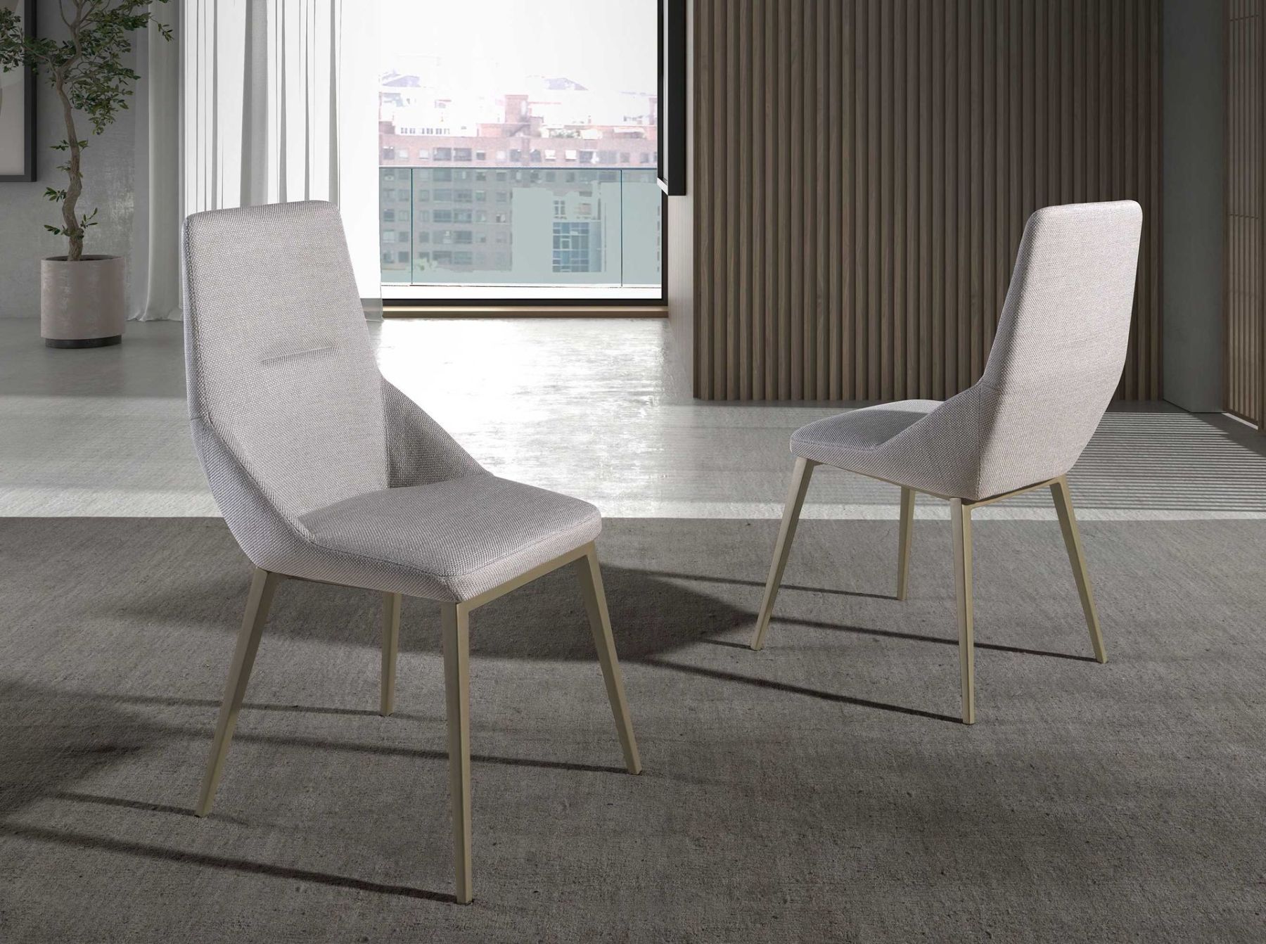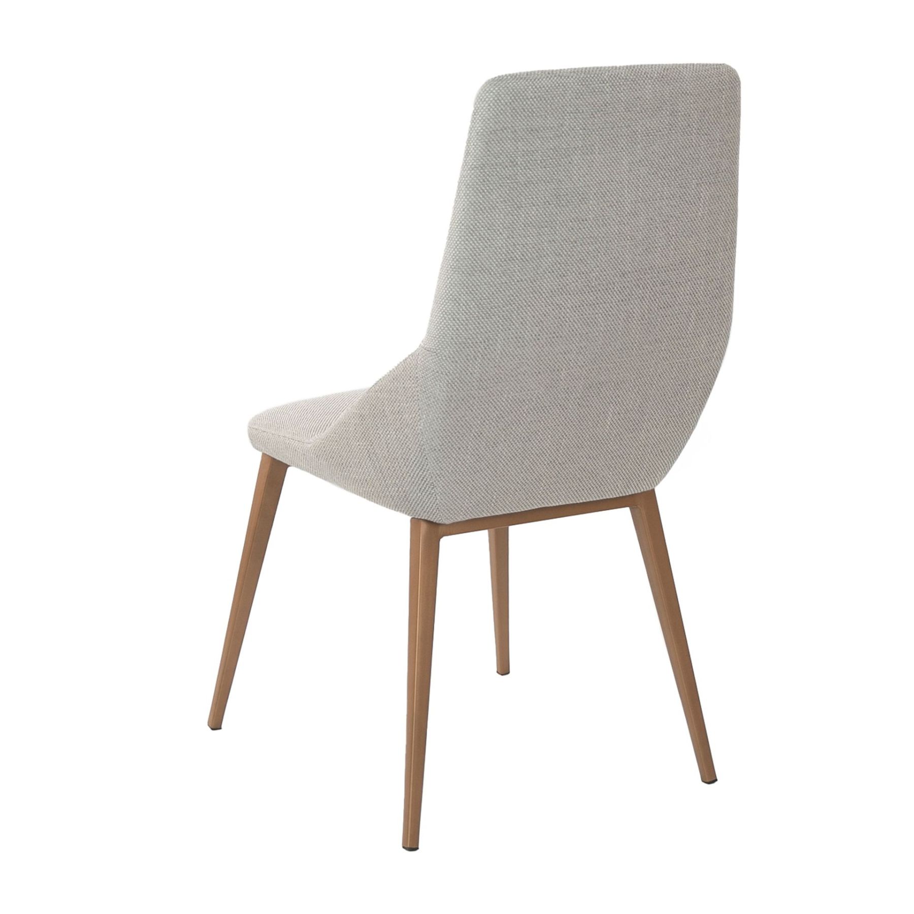 Кресло современного дизайна с сиденьем и спинкой, обитое светло-серой тканью. Его ножки из нержавеющей стали золотистого цвета с авангардной, но вневременной металлической отделкой сделают его обязательным для вашей кухни или столовой.