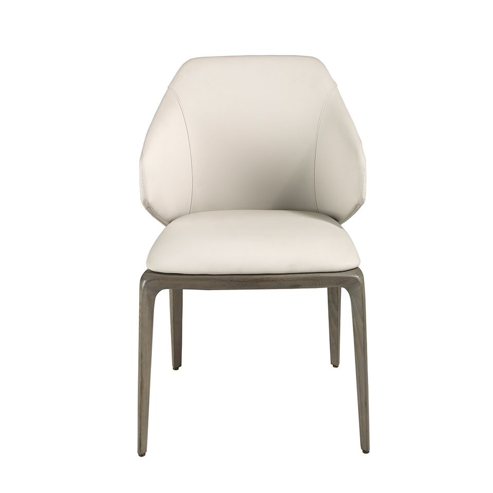 Стул современного дизайна с сиденьем и спинкой, обитыми кожзамом кремового цвета. Ножки из дуба ясеневого цвета в авангардном, но вневременном стиле сделают его незаменимым на вашей кухне или столовой.