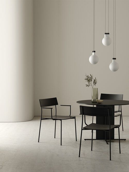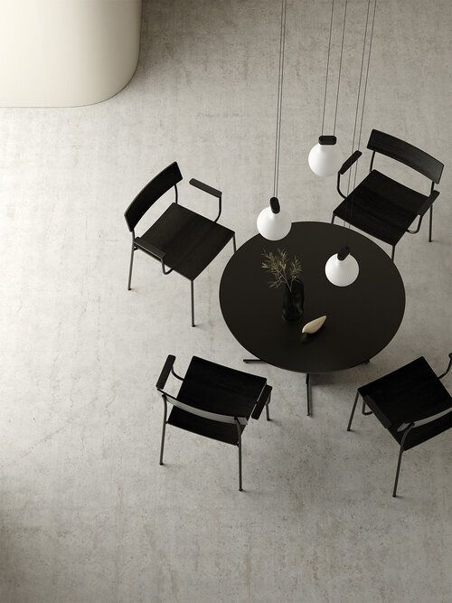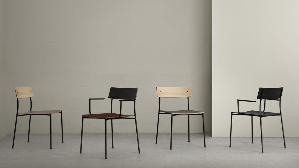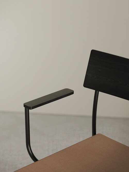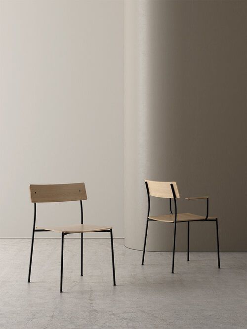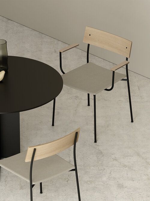 Основа стула выполнена из стали с черным порошковым покрытием. Сиденье, спинка и подлокотники из фанеры дуба в натуральной отделке или окрашенного. Вариант с сиденьем, обитым тканью. Штабелируется до 4 единиц.