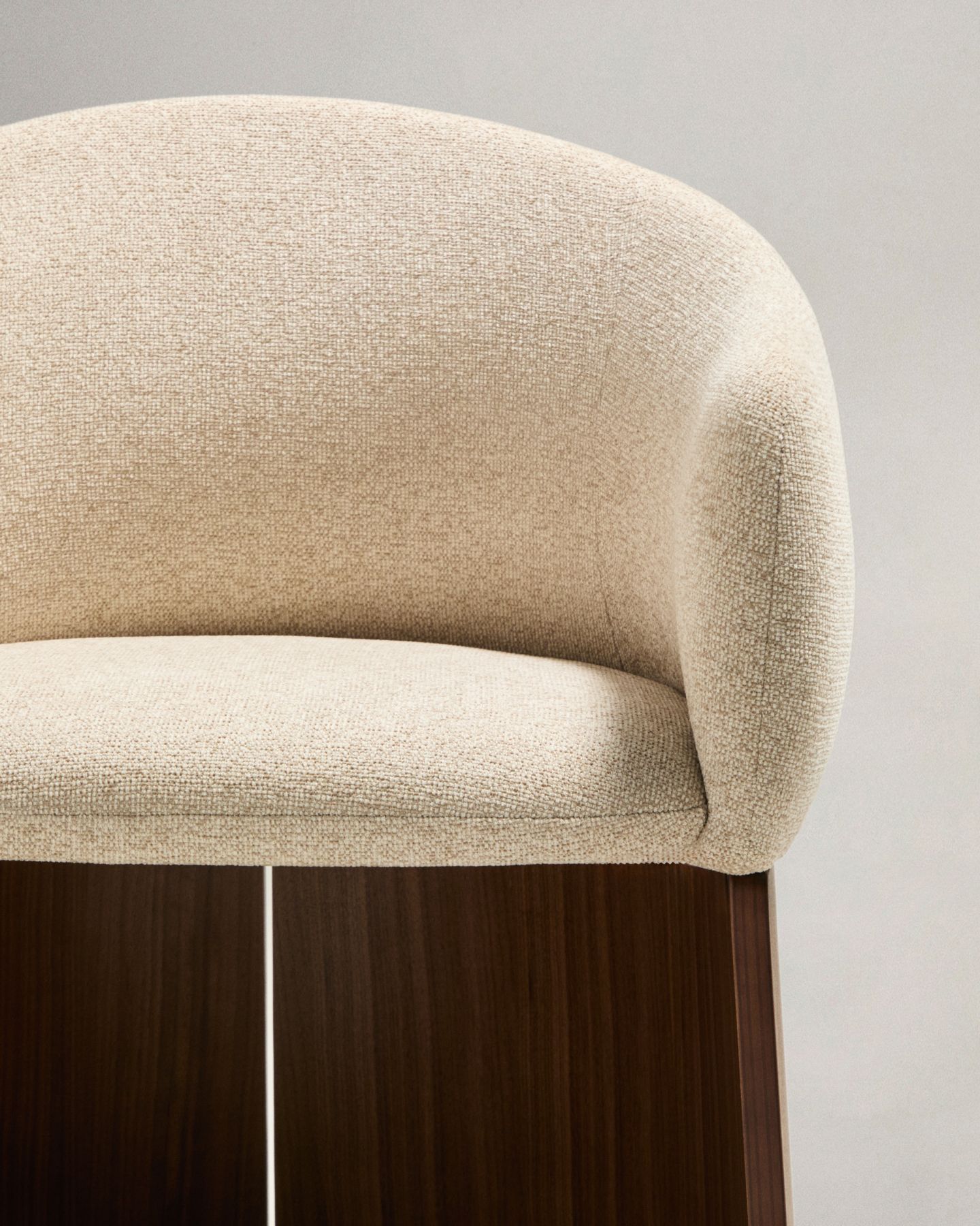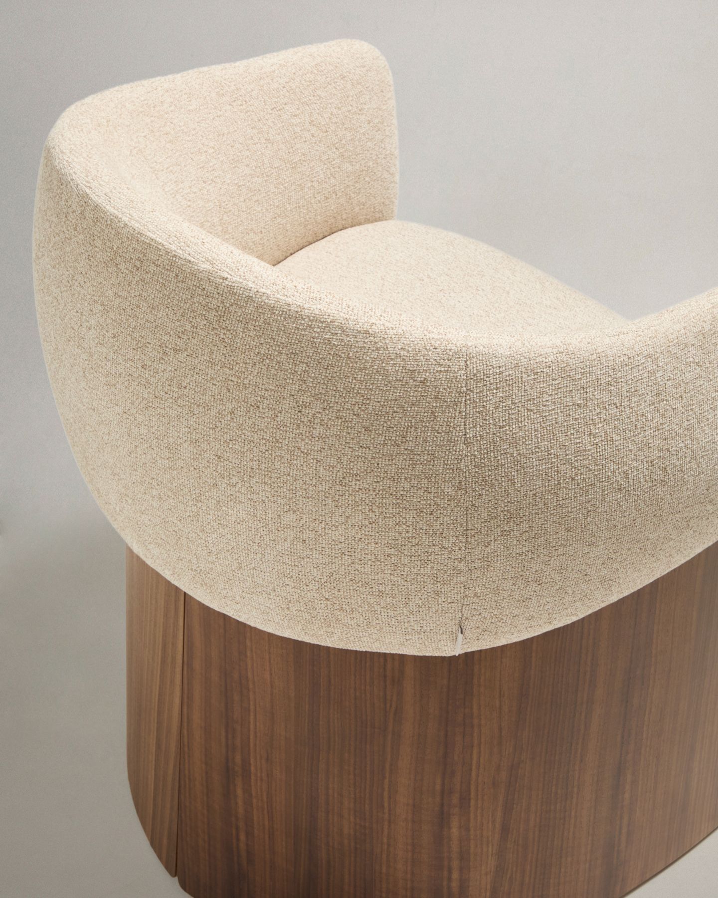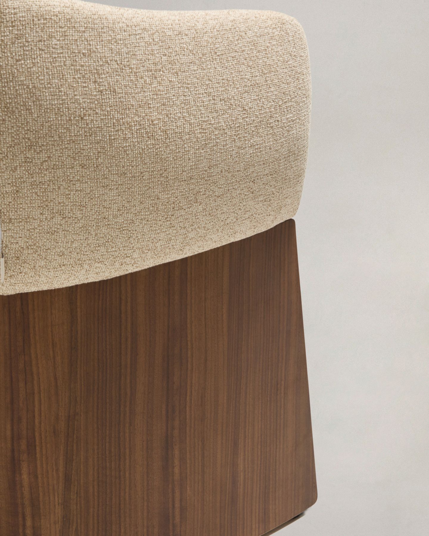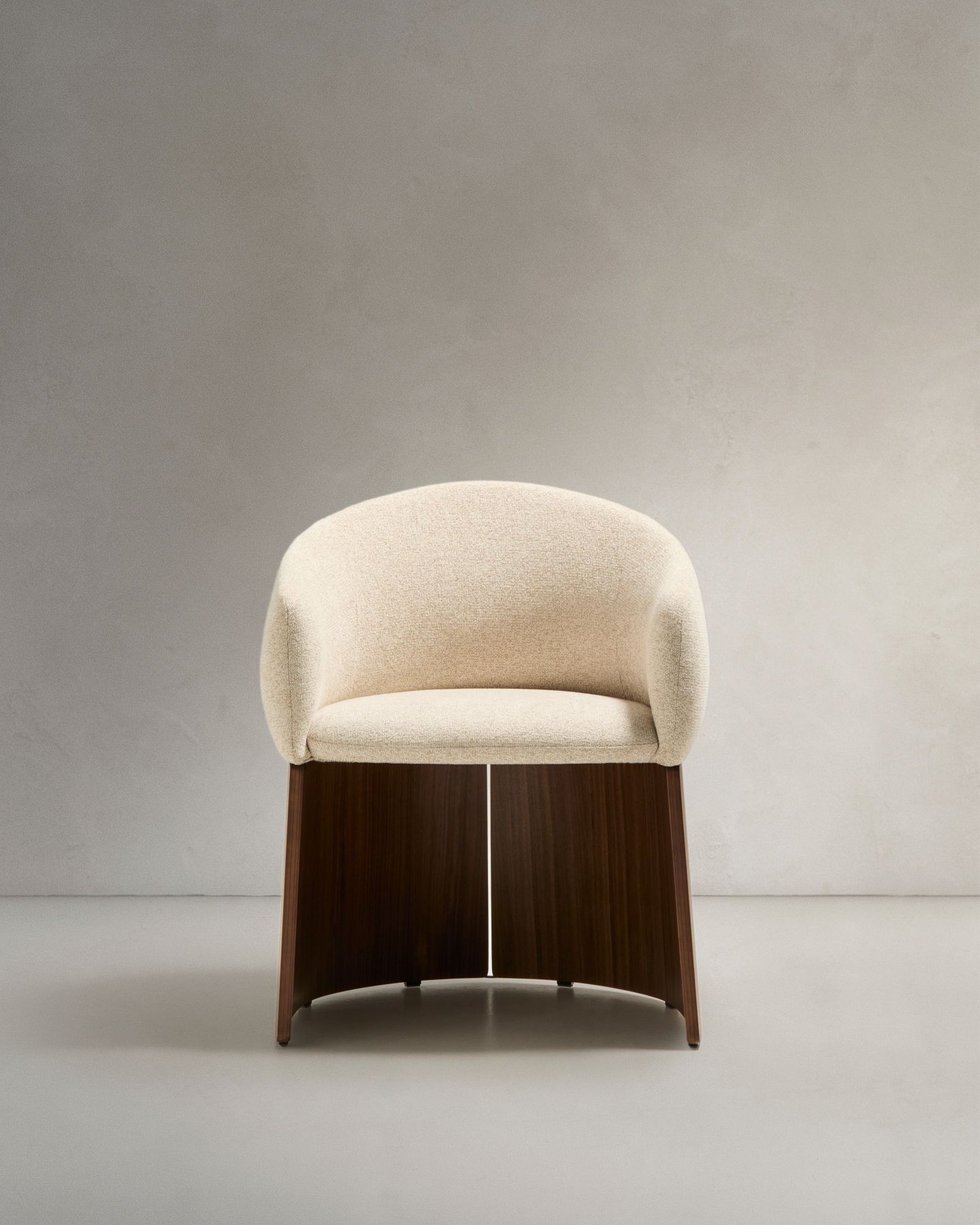 Этот стул отличается сбалансированным дизайном: широкое, удобное сиденье опирается на деревянное основание, покрытое ореховым шпоном. Матовое полиуретановое покрытие защищает поверхность и придает изделию теплоту. Древесина сертифицирована по системе FSC™ 100% и соответствует модели ответственного лесоуправления. Обивка выполнена из мелкоструктурного шенилла: мягкого на ощупь, прочного и долговечного, изготовленного из 100% переработанного полиэстера от поставщика, сертифицированного по Глобальному стандарту переработки.