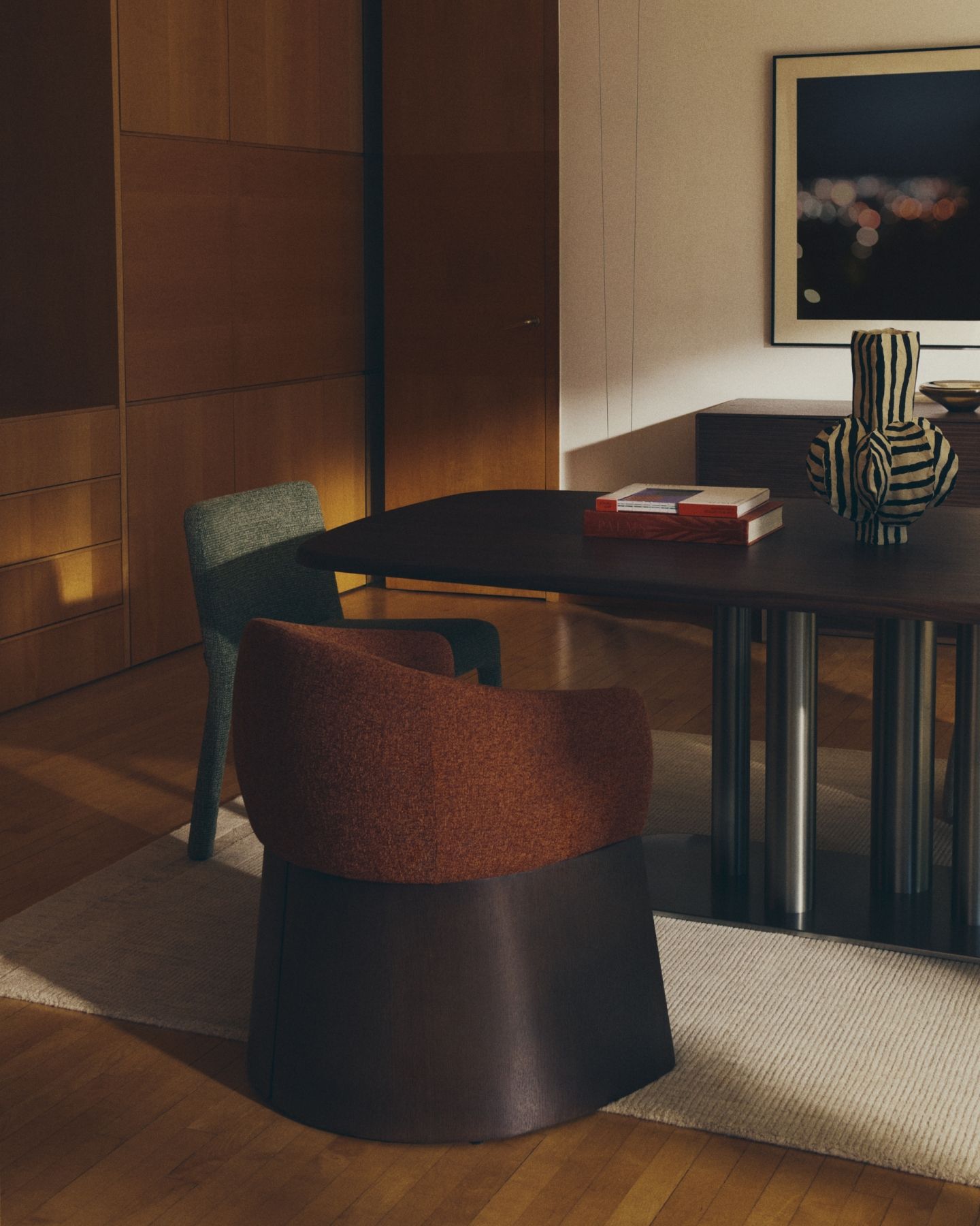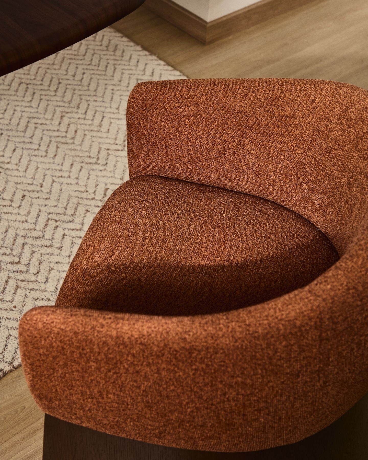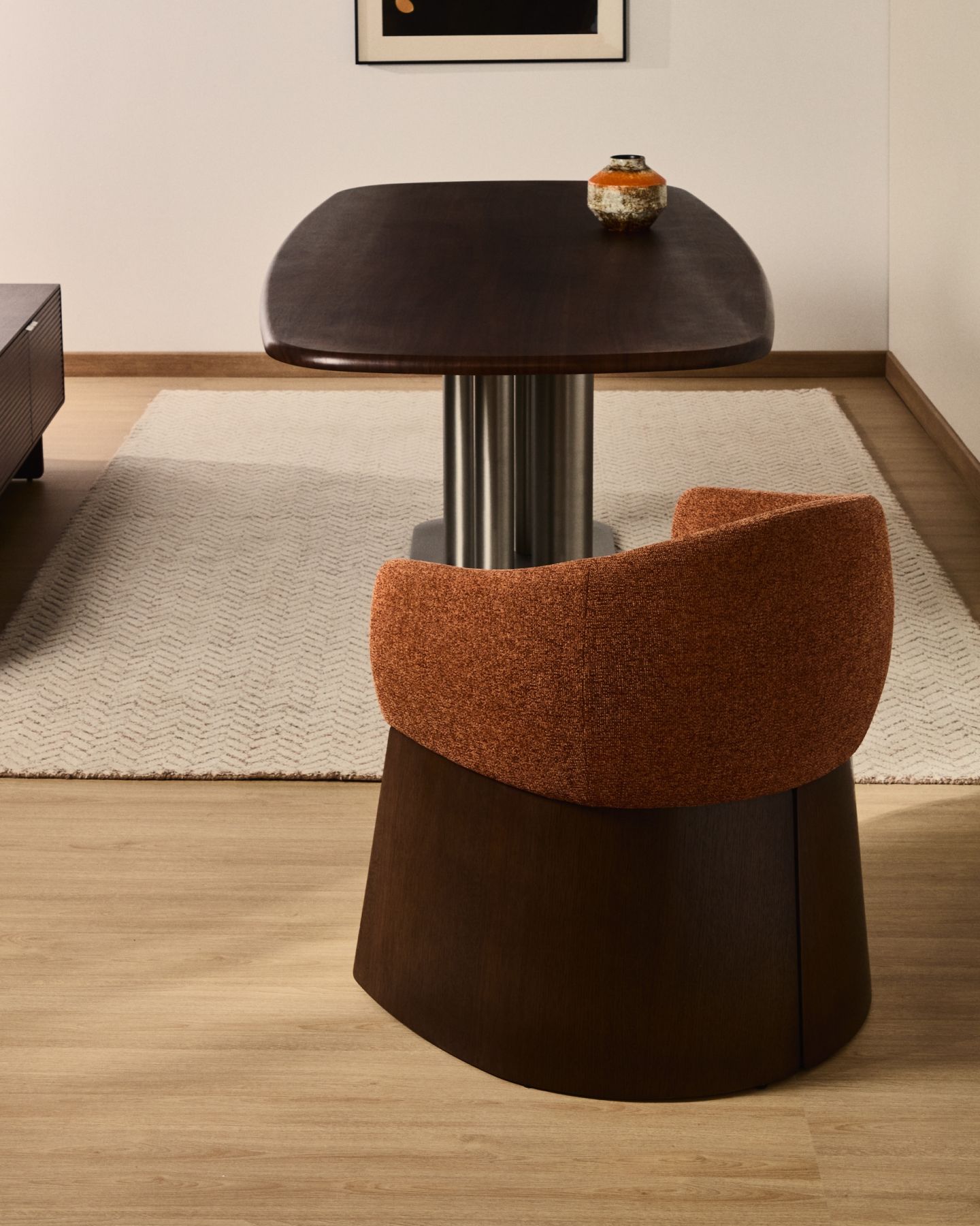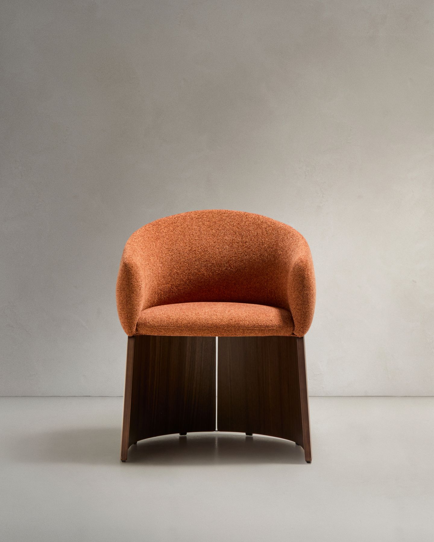 Этот стул отличается сбалансированным дизайном: широкое, удобное сиденье опирается на деревянное основание, покрытое ореховым шпоном. Матовое полиуретановое покрытие защищает поверхность и придает изделию теплоту. Древесина сертифицирована по системе FSC™ 100% и соответствует модели ответственного лесоуправления. Обивка выполнена из мелкоструктурного шенилла: мягкого на ощупь, прочного и долговечного, изготовленного из 100% переработанного полиэстера от поставщика, сертифицированного по Глобальному стандарту переработки.