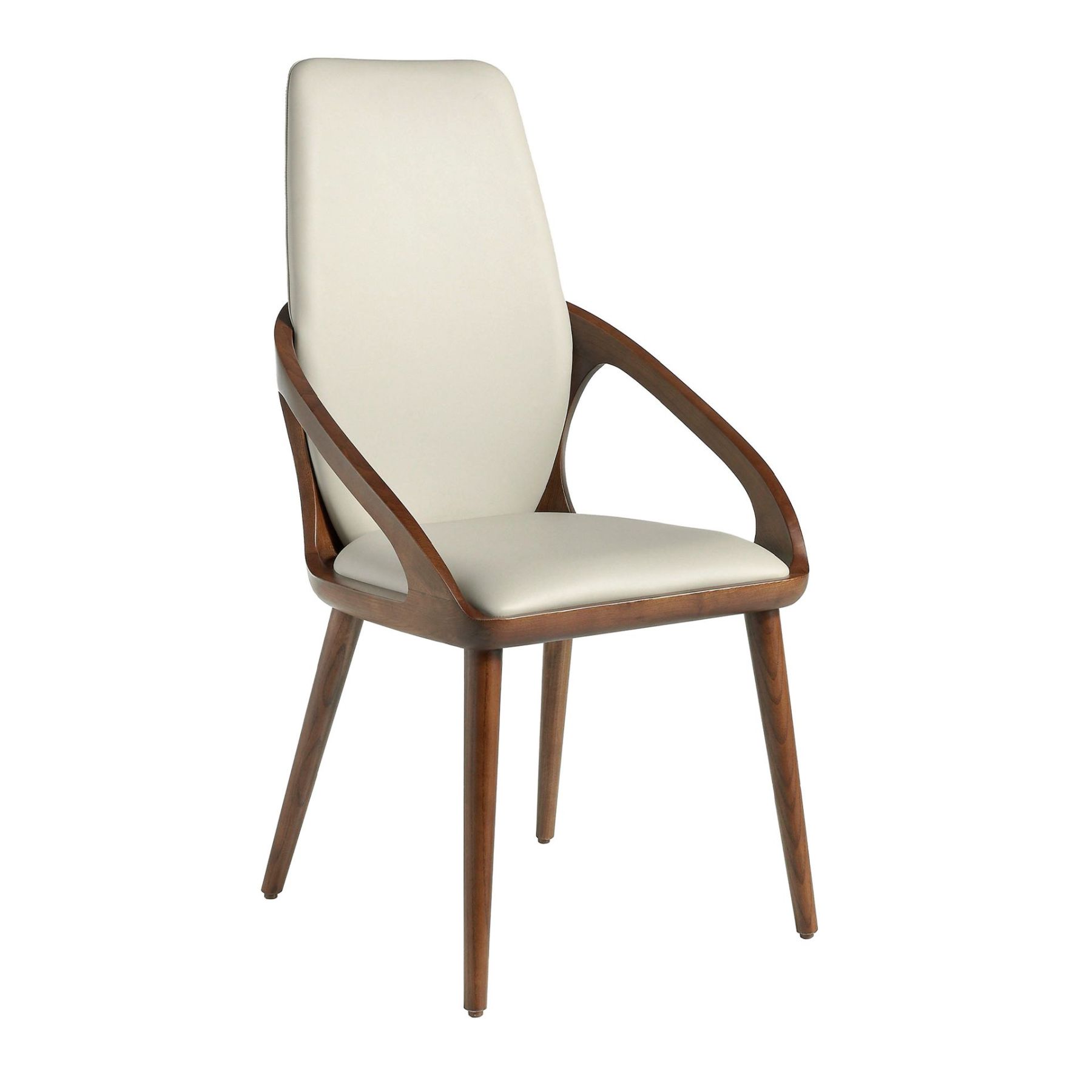 Кресло обито кремовым кожзаменителем, цвет Acua 07, со структурой из ясеня, окрашенной в ореховый цвет. Спинка и сиденье из пенополиуретана плотностью 35 кг / м3.