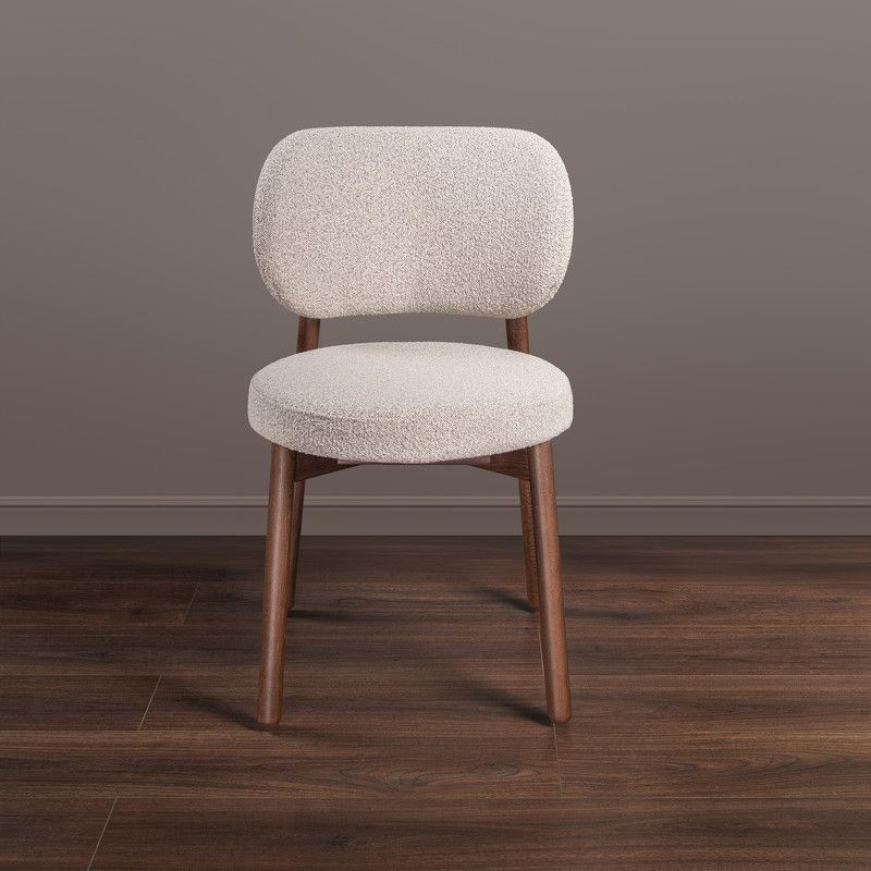 Каркас стула — МДФ и массива бука. Ножки стула из массива бука в цвете итальянский орех, обивка ткань букле в бежевых оттенках.