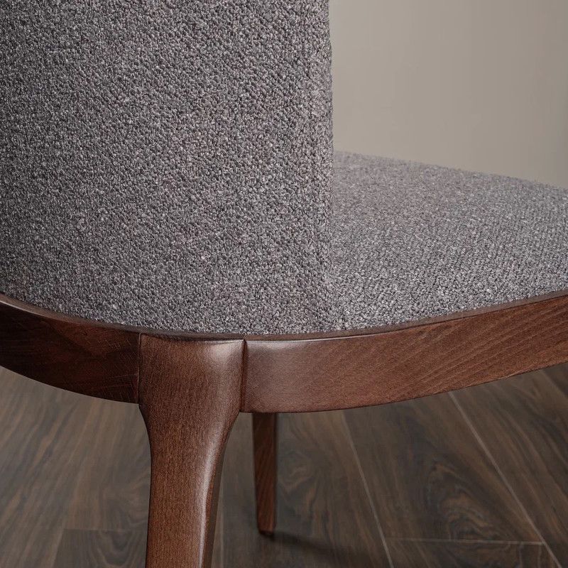 Каркас и ножки стула выполнены из массива бука. Сидение - из МДФ высокой плотности. Спинка - многослойная фанера. Обивка - ткань букле в серых тонах. Отделка стула - бук, тонированный под орех.
