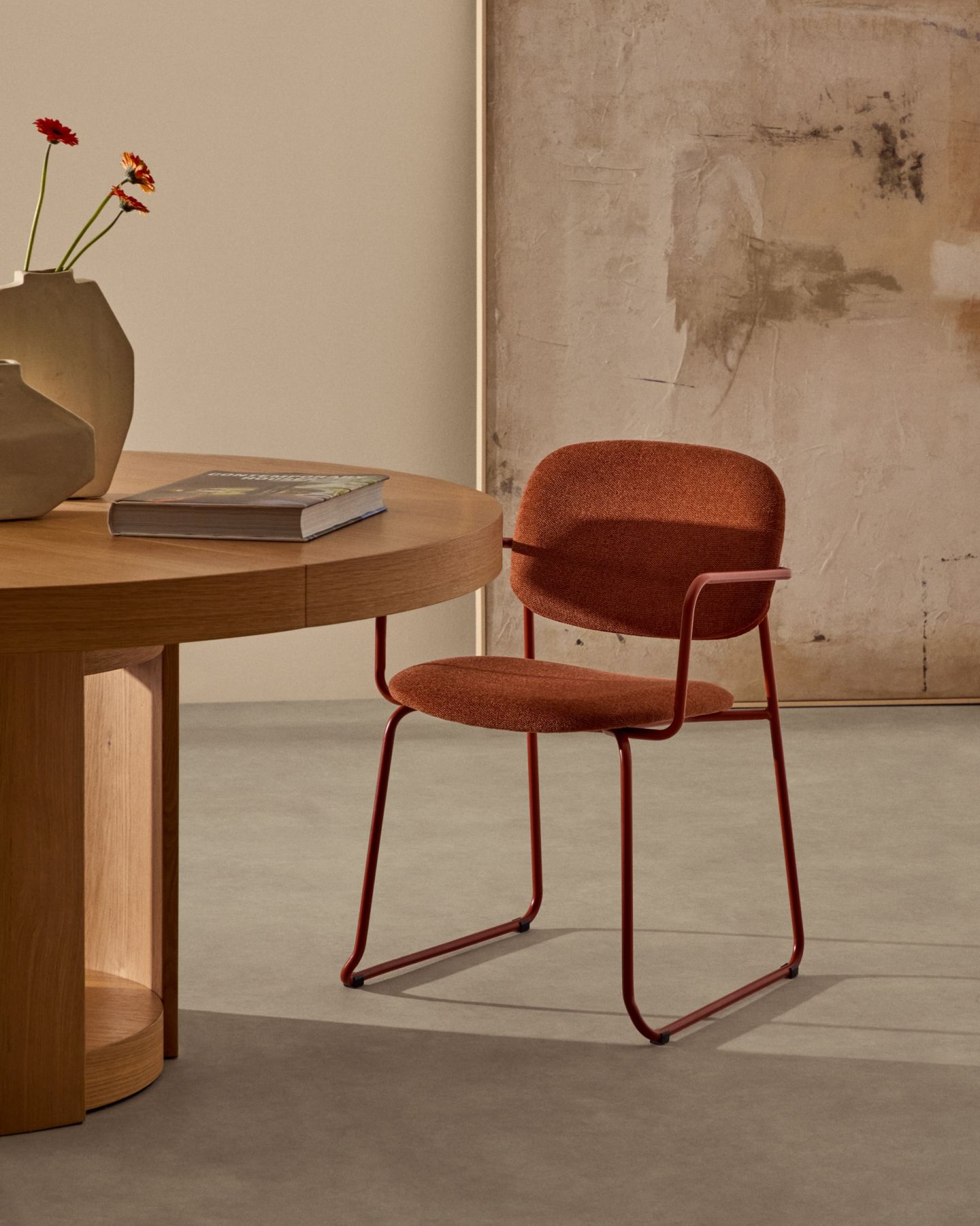 Дизайн дополняют подлокотники и ножки из микротекстурированного металла нежного бежевого тона, что добавляет современный и изысканный штрих. Используемая древесина имеет сертификат FSC Mix Credit, который гарантирует, что она изготовлена из смеси материалов из сертифицированных FSC лесов и контролируемой FSC древесины. Каждый стул уникален благодаря тщательному выбору ясеневого шпона, который гарантирует естественные вариации в дизайне, делая каждое изделие эксклюзивным.